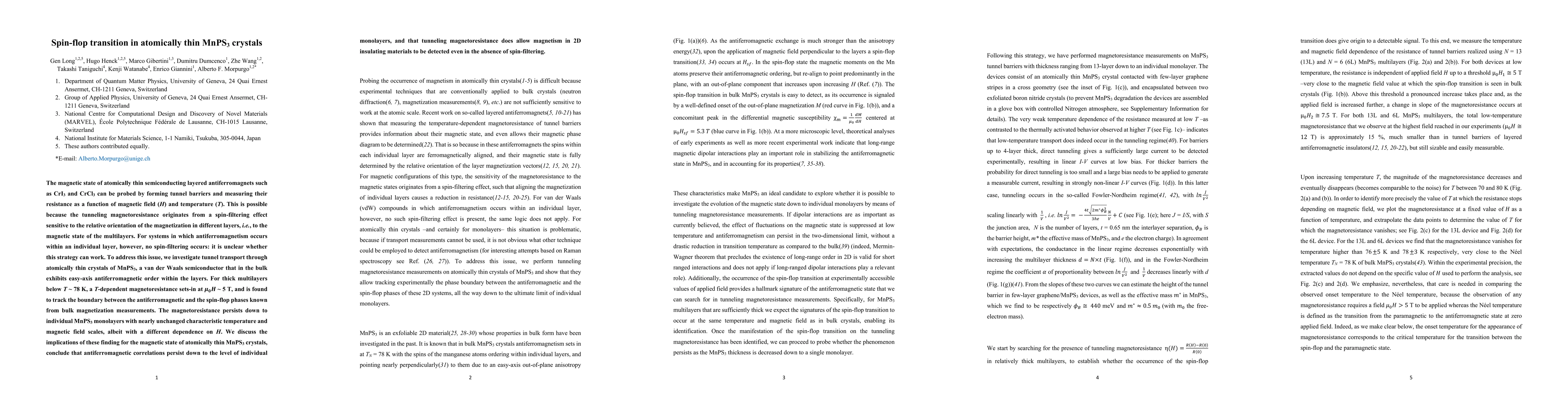 This paper investigates the spin-flop transition in atomically thin MnPS$_3$ crystals using tunneling magnetoresistance measurements. It finds that despite the absence of spin-filtering in antiferromagnetic layers, the technique can detect magnetism in 2D insulating materials, with antiferromagnetic correlations persisting down to individual monolayers.