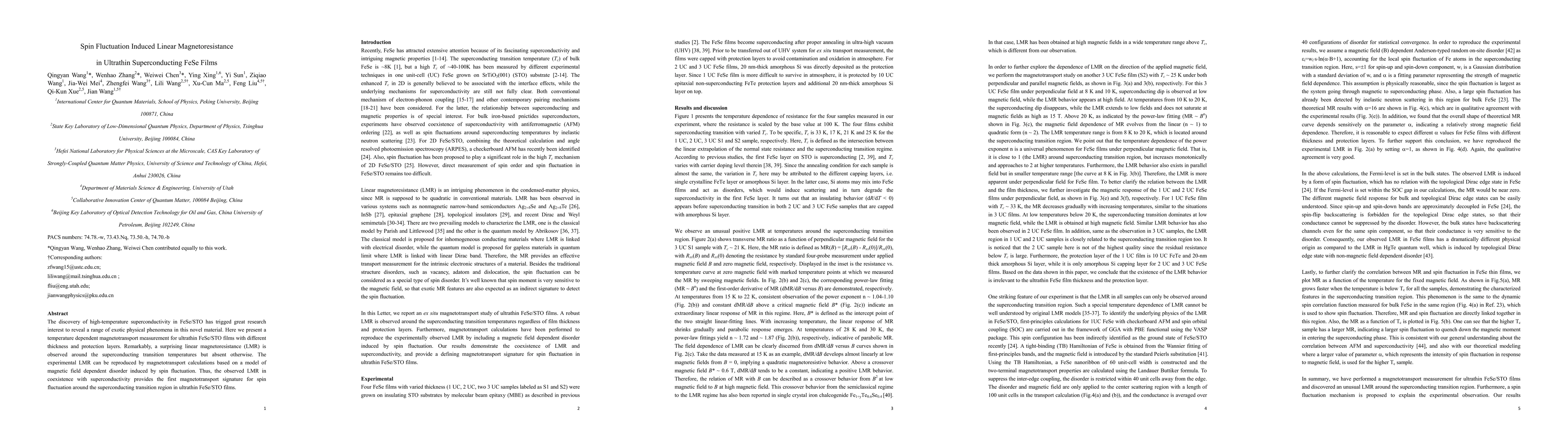 This study reveals a temperature-dependent linear magnetoresistance (LMR) in ultrathin FeSe/STO films near the superconducting transition, attributed to spin fluctuation-induced disorder. The observed LMR provides the first magnetotransport evidence of spin fluctuations coexisting with superconductivity in these films.