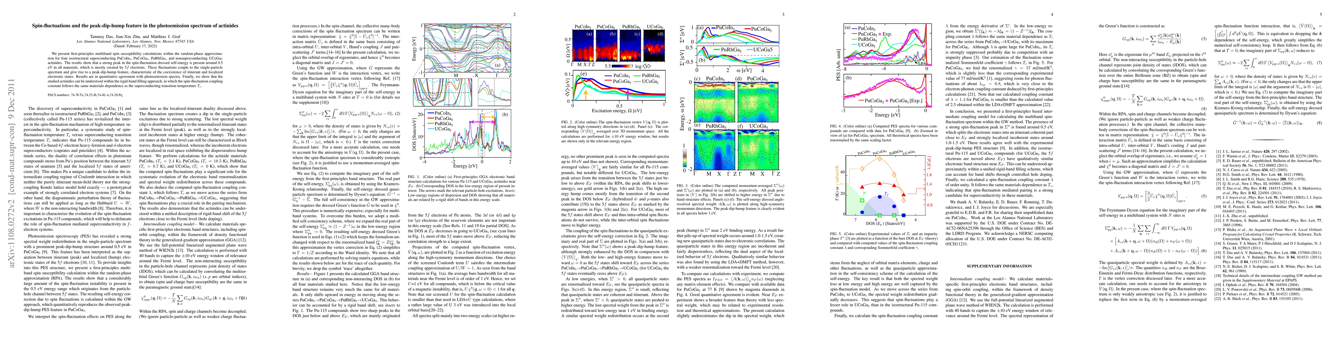 This study uses first-principles calculations to analyze spin fluctuations in actinide materials, revealing a strong peak in spin-fluctuation dressed self-energy around 0.5 eV, primarily from 5$f$ electrons, leading to a peak-dip-hump feature in photoemission spectra. The findings align with the coexistence of itinerant and localized electronic states and correlate the spin-fluctuation coupling with superconducting transition temperature $T_c$.