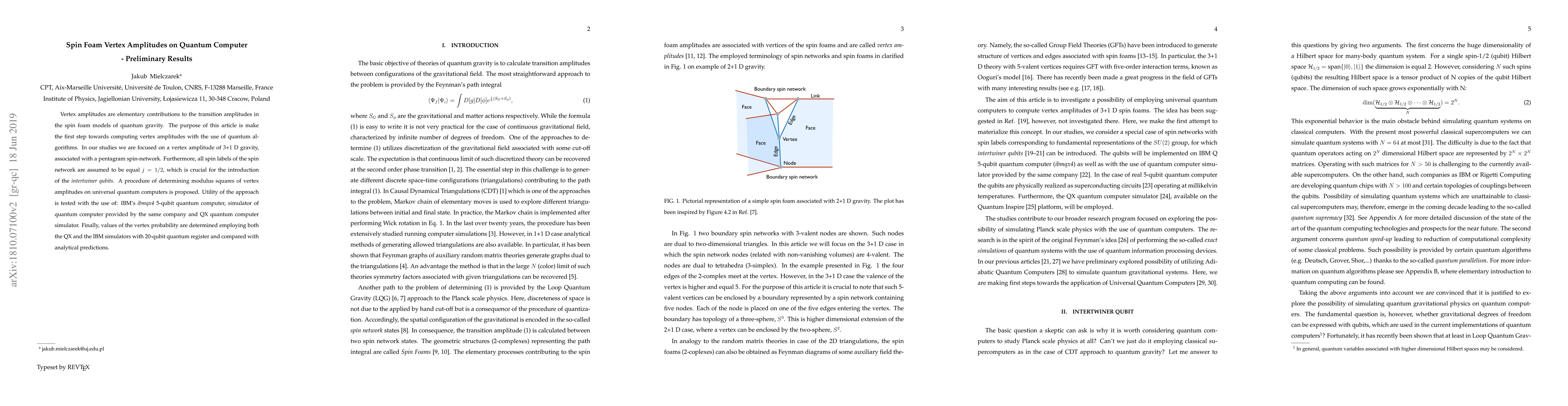 Vertex amplitudes are elementary contributions to the transition amplitudes in the spin foam models of quantum gravity. The purpose of this article is make the first step towards computing vertex amplitudes with the use of quantum algorithms. In our studies we are focused on a vertex amplitude of 3+1 D gravity, associated with a pentagram spin-network. Furthermore, all spin labels of the spin network are assumed to be equal $j=1/2$, which is crucial for the introduction of the \emph{intertwiner qubits}. A procedure of determining modulus squares of vertex amplitudes on universal quantum computers is proposed. Utility of the approach is tested with the use of: IBM's \emph{ibmqx4} 5-qubit quantum computer, simulator of quantum computer provided by the same company and QX quantum computer simulator. Finally, values of the vertex probability are determined employing both the QX and the IBM simulators with 20-qubit quantum register and compared with analytical predictions.