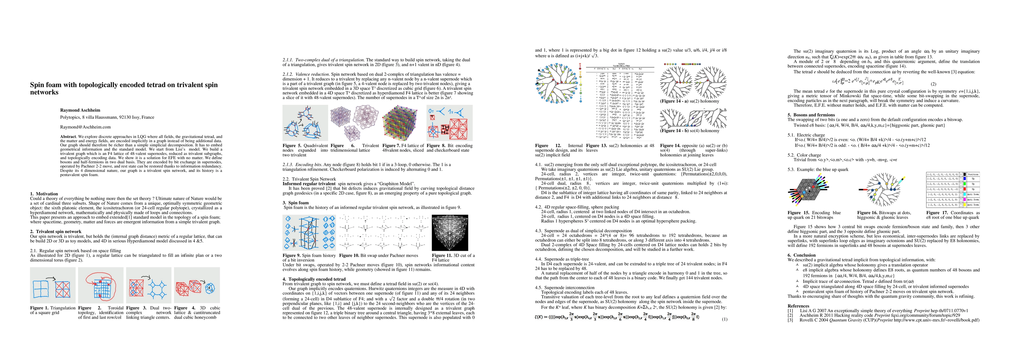 We explore discrete approaches in LQG where all fields, the gravitational tetrad, and the matter and energy fields, are encoded implicitly in a graph instead of being additional data. Our graph should therefore be richer than a simple simplicial decomposition. It has to embed geometrical information and the standard model. We start from Lisi's model. We build a trivalent graph which is an F4 lattice of 48-valent supernodes, reduced as trivalent subgraphs, and topologically encoding data. We show it is a solution for EFE with no matter. We define bosons and half-fermions in two dual basis. They are encoded by bit exchange in supernodes, operated by Pachner 2-2 move, and rest state can be restored thanks to information redundancy. Despite its 4 dimensional nature, our graph is a trivalent spin network, and its history is a pentavalent spin foam.