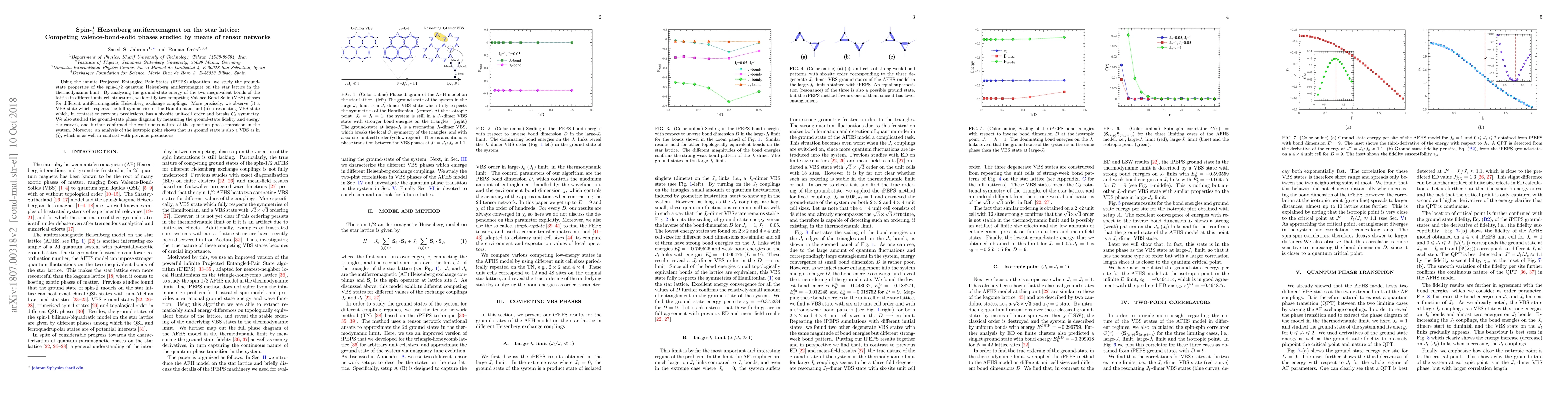 The research uses tensor networks, specifically the infinite Projected Entangled Pair States (iPEPS) algorithm, to study the ground-state properties of a spin-1/2 quantum Heisenberg antiferromagnet on a star lattice. It identifies two competing Valence-Bond-Solid (VBS) phases, one respecting full symmetries and the other a resonating VBS with six-site unit-cell order breaking C3 symmetry. The study also confirms a continuous quantum phase transition and redefines the isotropic point ground state as a VBS, contradicting previous predictions.