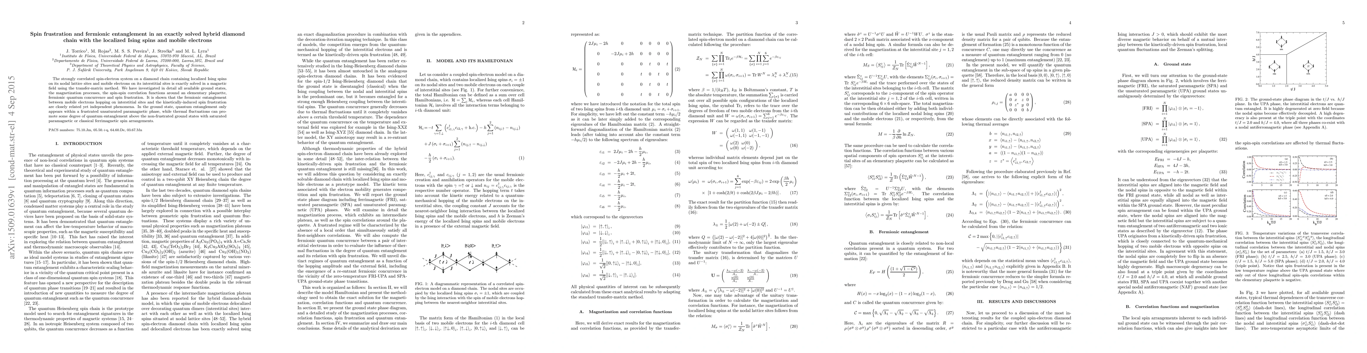 This paper exactly solves a hybrid diamond chain system with localized Ising spins and mobile electrons using the transfer-matrix method, revealing that fermionic entanglement and spin frustration are related yet independent phenomena, with entanglement occurring in a frustrated paramagnetic phase.