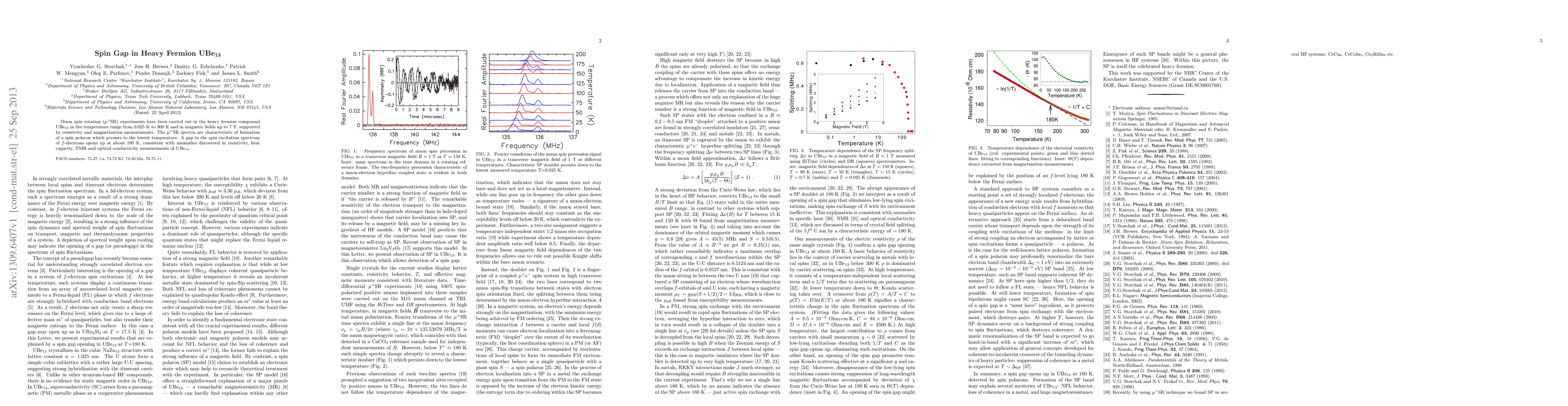 Muon spin rotation ($\mu^+$SR) experiments have been carried out in the heavy fermion compound UBe$_{13}$ in the temperature range from 0.025 K to 300 K and in magnetic fields up to 7 T, supported by resistivity and magnetization measurements. The $\mu^+$SR spectra are characteristic of formation of a spin polaron which persists to the lowest temperature. A gap in the spin excitation spectrum of f-electrons opens up at about 180 K, consistent with anomalies discovered in resistivity, heat capacity, NMR and optical conductivity measurements of UBe$_{13}$.