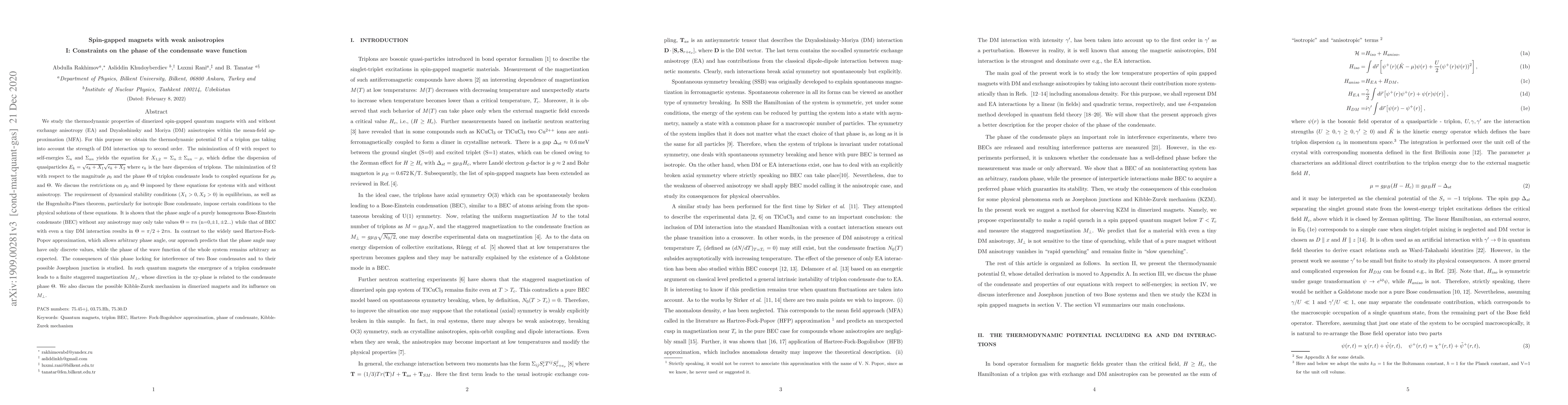 We study the thermodynamic properties of dimerized spin-gapped quantum magnets with and without exchange anisotropy (EA) and Dzyaloshinsky and Moriya (DM) anisotropies within the mean-field approximation (MFA). For this purpose we obtain the thermodynamic potential $\Omega$ of a triplon gas taking into account the strength of DM interaction up to second order. The minimization of $\Omega$ with respect to self-energies $\Sigma_n$ and $\Sigma_{an}$ yields the equation for $X_{1,2}=\Sigma_n\pm\Sigma_{an}-\mu$, which define the dispersion of quasiparticles $E_k=\sqrt{\epsilon_k+X_1}\sqrt{\epsilon_k+X_2}$ where $\epsilon_k$ is the bare dispersion of triplons. The minimization of $\Omega$ with respect to the magnitude $\rho_0$ and the phase $\Theta$ of triplon condensate leads to coupled equations for $\rho_0$ and $\Theta$. We discuss the restrictions on $\rho_0$ and $\Theta$ imposed by these equations for systems with and without anisotropy. The requirement of dynamical stability conditions $(X_1>0, X_2>0)$ in equilibrium, as well as the Hugenholtz-Pines theorem, particularly for isotropic Bose condensate, impose certain conditions to the physical solutions of these equations. It is shown that the phase angle of a purely homogenous Bose-Einstein condensate (BEC) without any anisotropy may only take values $\Theta=\pi n $ (n=0,$\pm 1,\pm 2$...) while that of BEC with even a tiny DM interaction results in $\Theta=\pi/2+2\pi n$. In contrast to the widely used Hartree-Fock-Popov approximation, which allows arbitrary phase angle, our approach predicts that the phase angle may have only discrete values, while the phase of the wave function of the whole system remains arbitrary as expected. The consequences of this phase locking for interference of two Bose condensates and to their possible Josephson junction is studied.