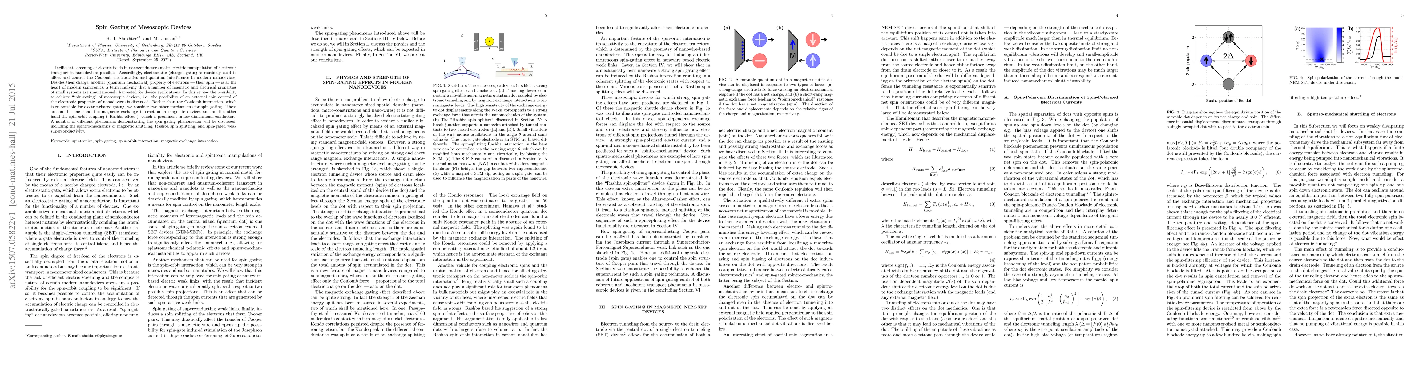Inefficient screening of electric fields in nanoconductors makes electric manipulation of electronic transport in nanodevices possible. Accordingly, electrostatic (charge) gating is routinely used to affect and control the Coulomb electrostatics and quantum interference in modern nanodevices. Besides their charge, another (quantum mechanical) property of electrons - their spin - is at the heart of modern spintronics, a term implying that a number of magnetic and electrical properties of small systems are simultaneously harvested for device applications. In this review the possibility to achieve "spin gating" of mesoscopic devices, i.e. the possibility of an external spin control of the electronic properties of nanodevices is discussed. Rather than the Coulomb interaction, which is responsible for electric-charge gating, we consider two other mechanisms for spin gating. These are on the one hand the magnetic exchange interaction in magnetic devices and on the other hand the spin-orbit coupling ("Rashba effect"), which is prominent in low dimensional conductors. A number of different phenomena demonstrating the spin gating phenomenon will be discussed, including the spintro-mechanics of magnetic shuttling, Rashba spin splitting, and spin-gated weak superconductivity.