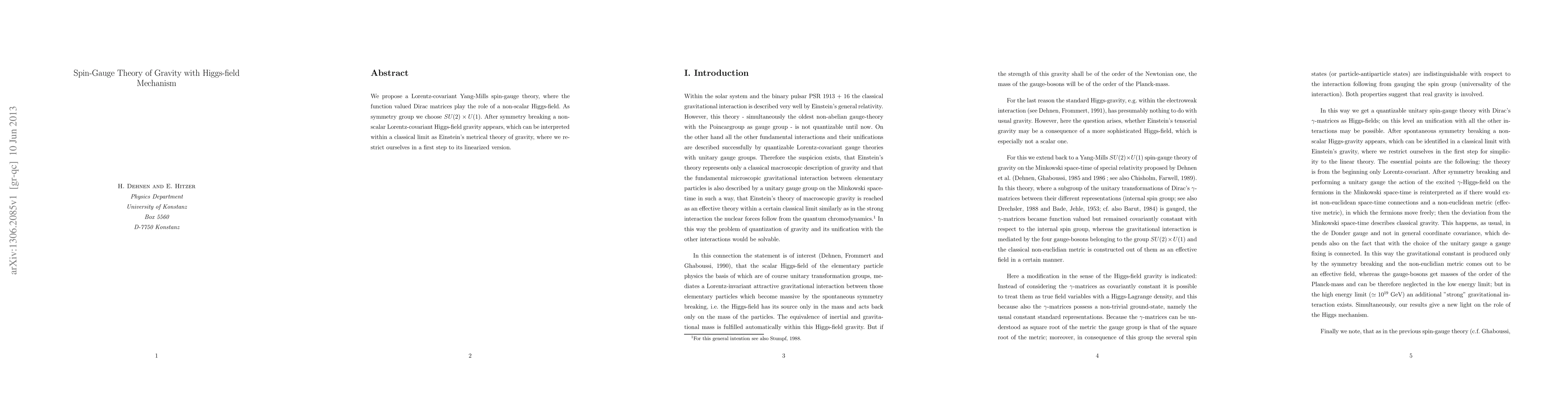 We propose a Lorentz-covariant Yang-Mills spin-gauge theory, where the function valued Dirac matrices play the role of a non-scalar Higgs-field. As symmetry group we choose $SU(2) \times U(1)$. After symmetry breaking a non-scalar Lorentz-covariant Higgs-field gravity appears, which can be interpreted within a classical limit as Einstein's metrical theory of gravity, where we restrict ourselves in a first step to its linearized version.