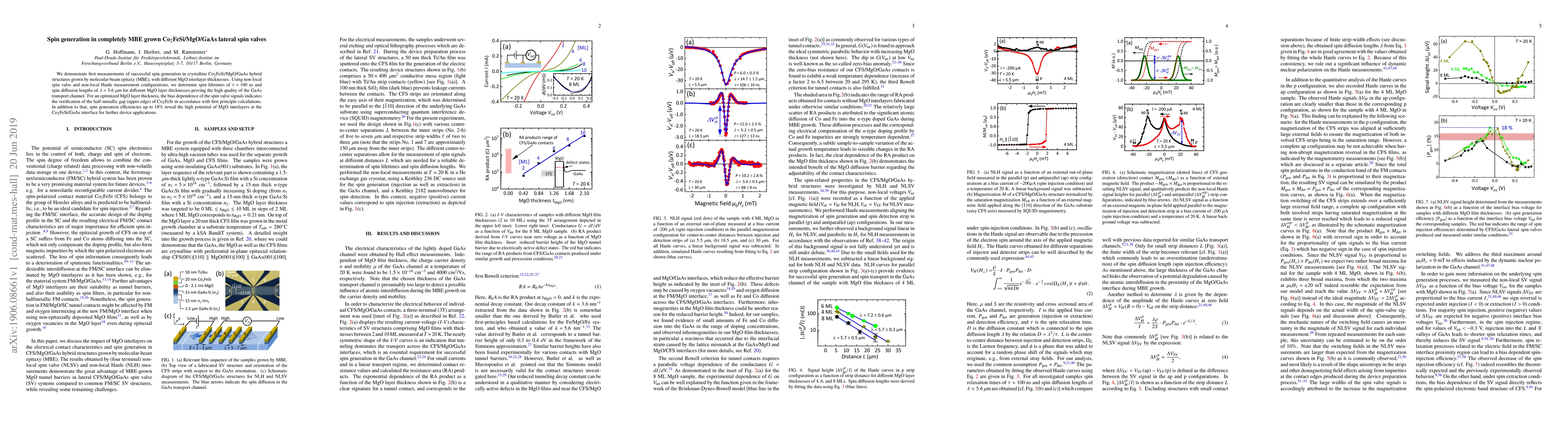 This paper reports the first successful spin generation in MBE-grown Co$_2$FeSi/MgO/GaAs hybrid structures, achieving spin lifetimes of ~100 ns and diffusion lengths of ~5.6 µm. Optimized MgO interlayers demonstrate high spin generation efficiency of up to 18%, confirming the half-metallic gap of Co$_2$FeSi.