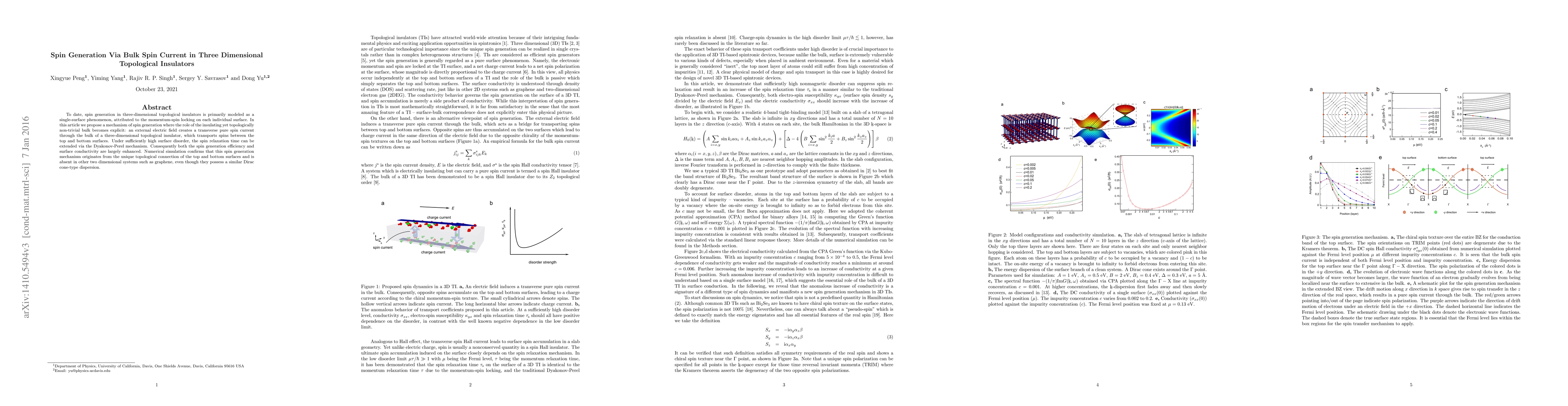 This paper proposes a novel mechanism for spin generation in three-dimensional topological insulators where an external electric field induces a transverse spin current through the insulating bulk, enhancing spin generation efficiency and surface conductivity. Numerical simulations confirm this mechanism is unique to topological insulators and absent in graphene.