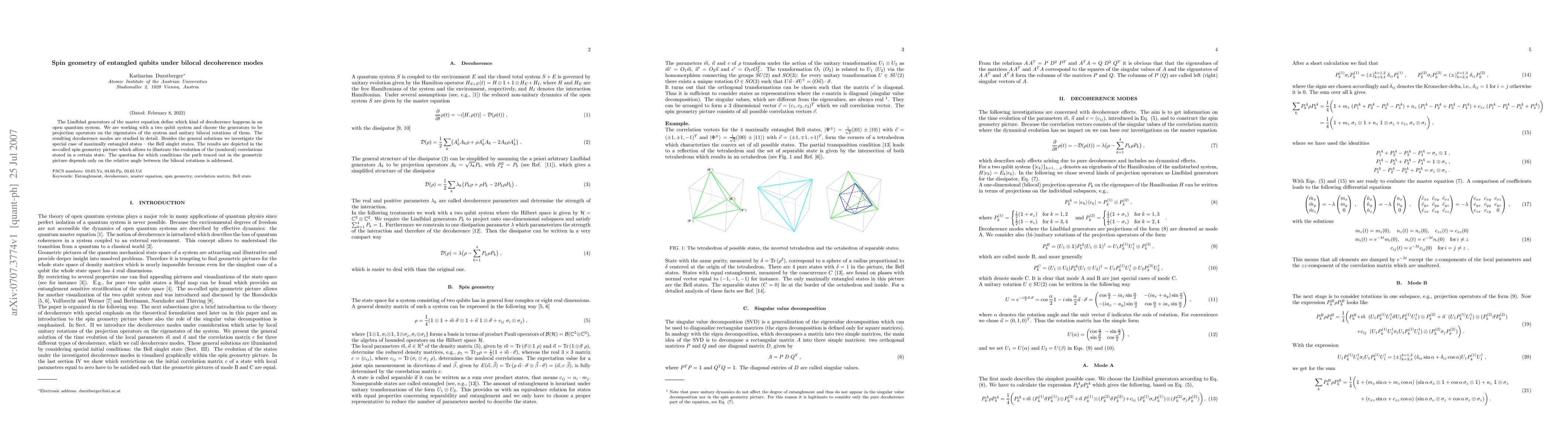 The Lindblad generators of the master equation define which kind of decoherence happens in an open quantum system. We are working with a two qubit system and choose the generators to be projection operators on the eigenstates of the system and unitary bilocal rotations of them. The resulting decoherence modes are studied in detail. Besides the general solutions we investigate the special case of maximally entangled states - the Bell singlet states. The results are depicted in the so-called spin geometry picture which allows to illustrate the evolution of the (nonlocal) correlations stored in a certain state. The question for which conditions the path traced out in the geometric picture depends only on the relative angle between the bilocal rotations is addressed.