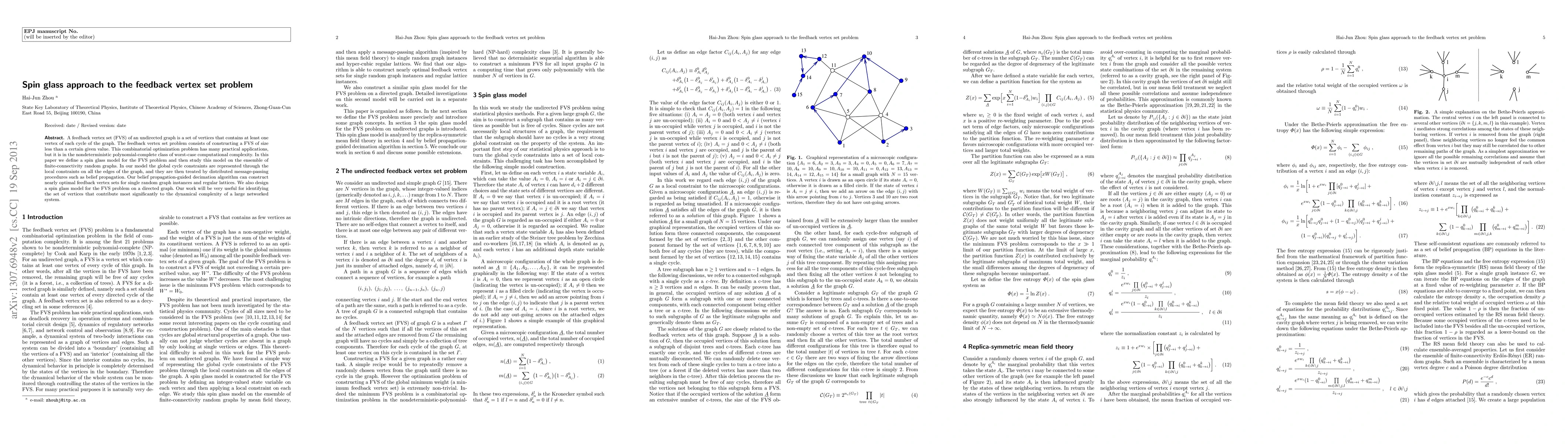 This paper proposes a spin glass model to tackle the computationally challenging feedback vertex set problem in undirected graphs, employing belief propagation to construct nearly optimal solutions. It also extends the approach to directed graphs, offering insights into the dynamical complexity of large networked systems.