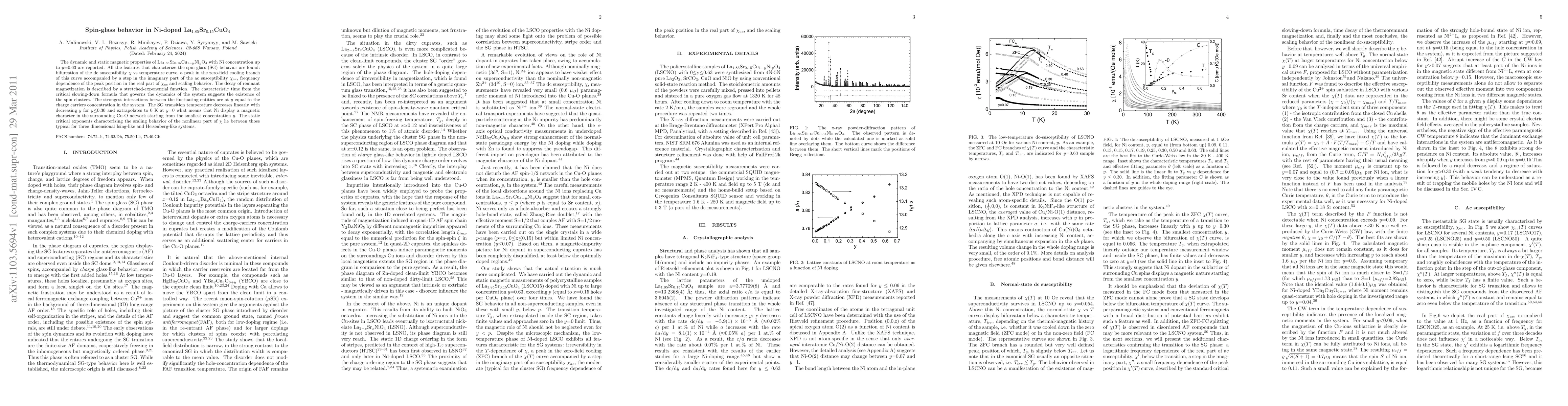 The dynamic and static magnetic properties of La1:85Sr0:15Cu1-yNiyO4 with Ni concentration up to y=0.63 are reported. All the features that characterize the spin-glass (SG) behavior are found: bifurcation of the dc susceptibility chi vs temperature curve, a peak in the zero-field cooling branch of this curve accompanied by a step in the imaginary part of the ac susceptibility chi_ac, frequency dependence of the peak position in the real part of chi_ac and scaling behavior. The decay of remnant magnetization is described by a stretched-exponential function. The characteristic time from the critical slowing-down formula that governs the dynamics of the system suggests the existence of the spin clusters. The strongest interactions between the fluctuating entities are at y equal to the charge carriers concentration in the system. The SG transition temperature decreases linearly with decreasing y for y<0.30 and extrapolates to 0 K at y=0 what means that Ni display a magnetic character in the surrounding Cu-O network starting from the smallest concentration y. The static critical exponents characterizing the scaling behavior of the nonlinear part of chi lie between those typical for three dimensional Ising-like and Heisenberg-like systems