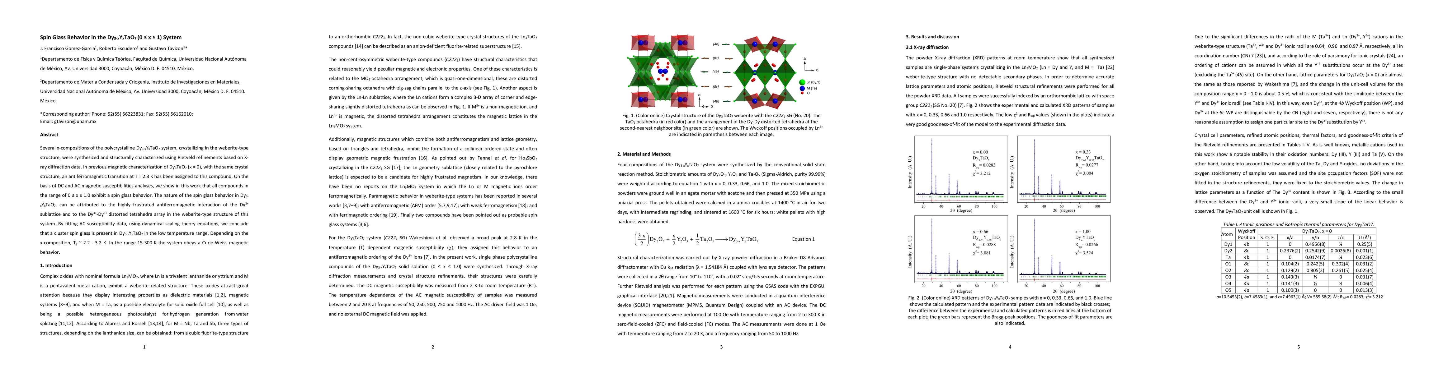 This study investigates Dy3-xYxTaO7 compounds, finding spin glass behavior across the entire x range of 0-1.0, attributed to frustrated antiferromagnetic interactions and structural distortions. The spin glass transition temperature varies from 2.2 to 3.2 K depending on the composition, indicating a cluster spin glass state in the low-temperature range.