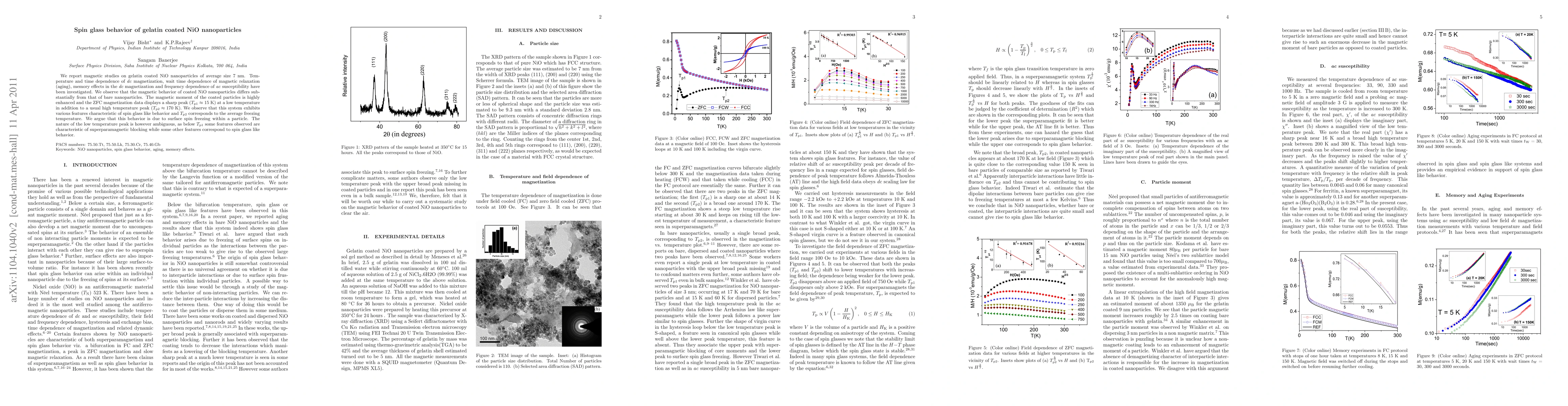 This study investigates the magnetic properties of gelatin-coated NiO nanoparticles, revealing enhanced magnetic moments and spin glass behavior at low temperatures, alongside superparamagnetic characteristics at higher temperatures, attributed to surface spin freezing within the particles. The system exhibits a sharp peak in ZFC magnetization at 15 K and a freezing temperature at 170 K.