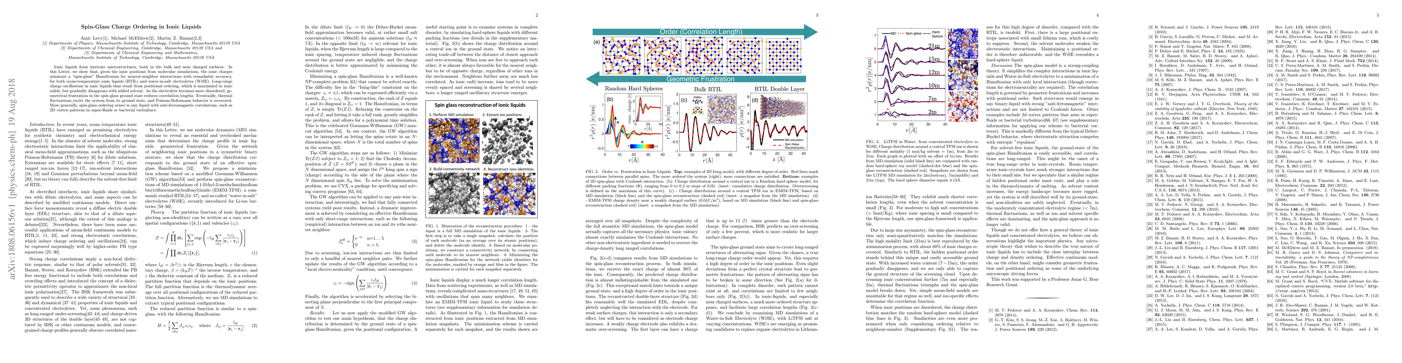 Ionic liquids form intricate microstructures, both in the bulk and near charged surfaces. In this Letter, we show that, given the ionic positions from molecular simulations, the ionic charges minimize a "spin-glass" Hamiltonian for nearest-neighbor interactions with remarkable accuracy, for both room-temperature ionic liquids (RTIL) and water-in-salt electrolytes (WiSE). Long-range charge oscillations in ionic liquids thus result from positional ordering, which is maximized in ionic solids, but gradually disappears with added solvent. As the electrolyte becomes more disordered, geometrical frustration in the spin-glass ground state reduces correlation lengths. Eventually, thermal fluctuations excite the system from its ground state, and Poisson-Boltzmann behavior is recovered. More generally, spin-glass ordering arises in any liquid with anti-ferromagnetic correlations, such as 2D vortex patterns in super-fluids or bacterial turbulence.