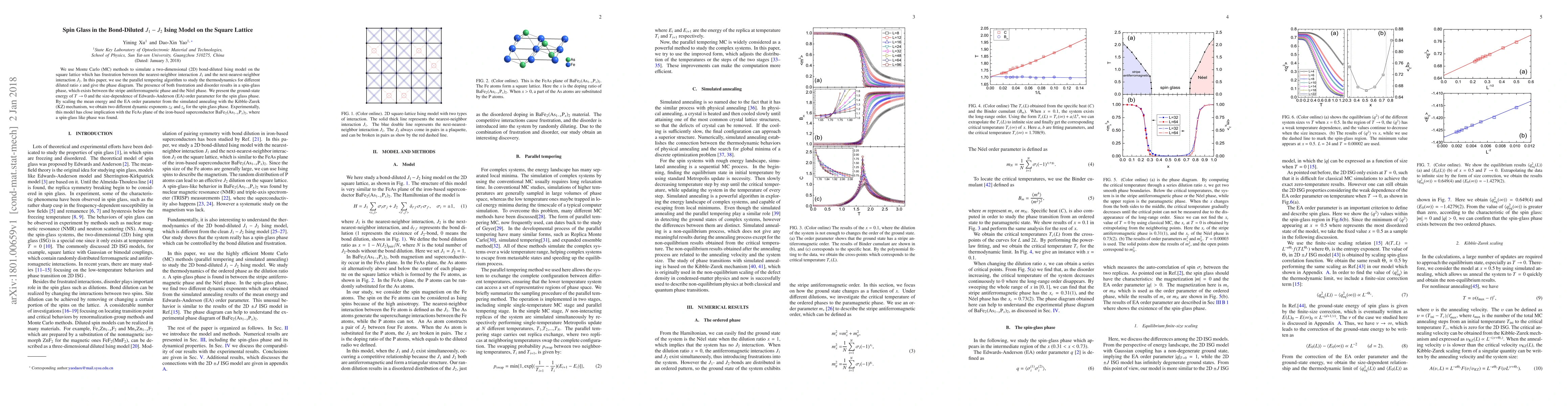 We use Monte Carlo (MC) methods to simulate a two-dimensional (2D) bond-diluted Ising model on the square lattice which has frustration between the nearest-neighbor interaction J1 and the next-nearest-neighbor interaction J2. In this paper, we use the parallel tempering algorithm to study the thermodynamics for different diluted ratio x and give the phase diagram. The presence of both frustration and disorder results in a spin-glass phase, which exists between the stripe antiferromagnetic phase and the Neel phase. We present the ground-state energy of T -> 0 and the size-dependence of Edwards-Anderson (EA) order parameter for the spin glass phase. By scaling the mean energy and the EA order parameter from the simulated annealing with the Kibble-Zurek (KZ) mechanism, we obtain two different dynamic exponents z_E and z_q for the spin glass phase. Experimentally, this model has close implication with the FeAs plane of the iron-based superconductor BaFe2(As(1-x)P(x))2, where a spin-glass like phase was found.