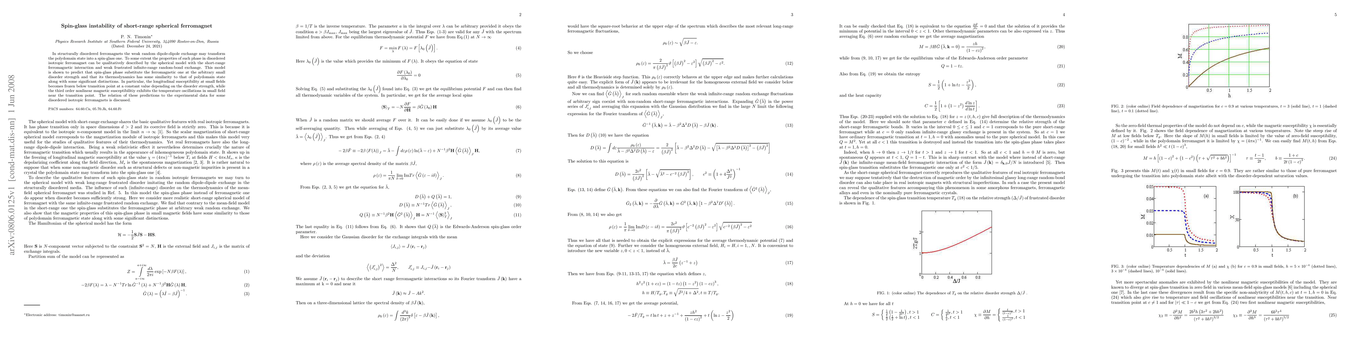 This paper investigates the spin-glass instability in structurally disordered ferromagnets, demonstrating that weak random dipole-dipole exchange can transform the polydomain state into a spin-glass state. The spherical model with short-range ferromagnetic interactions and weak random-bond exchange predicts the emergence of a spin-glass phase at minimal disorder, with distinct thermodynamic properties compared to the polydomain state.