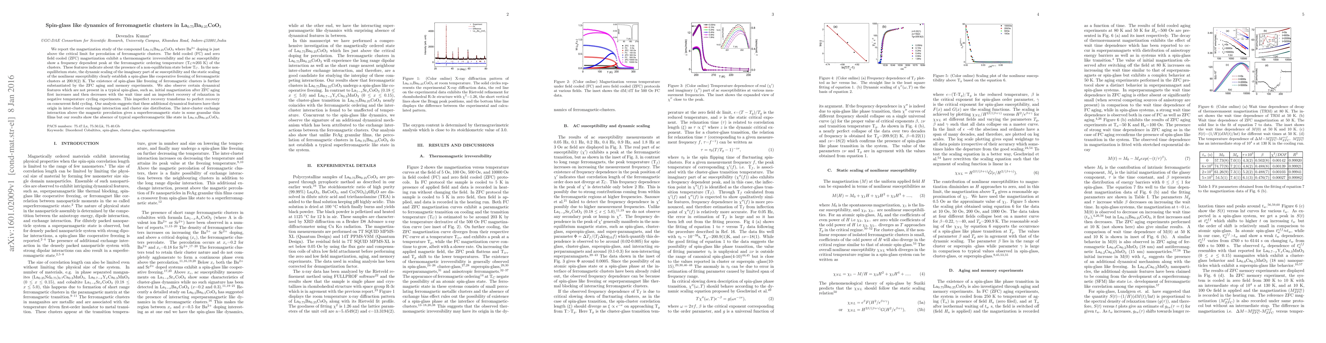 We report the magnetization study of the compound La$_{0.75}$Ba$_{0.25}$CoO$_3$ where Ba$^{2+}$ doping is just above the critical limit for percolation of ferromagnetic clusters. The field cooled (FC) and zero field cooled (ZFC) magnetization exhibit a thermomagnetic irreversibility and the ac susceptibility show a frequency dependent peak at the ferromagnetic ordering temperature (T$_C$$\approx$203~K) of the clusters. These features indicate about the presence of a non-equilibrium state below T$_C$. In the non-equilibrium state, the dynamic scaling of the imaginary part of ac susceptibility and the static scaling of the nonlinear susceptibility clearly establish a spin-glass like cooperative freezing of ferromagnetic clusters at 200.9(2)~K. The existence of spin-glass like freezing of ferromagnetic clusters is further substantiated by the ZFC aging and memory experiments. We also observe certain dynamical features which are not present in a typical spin-glass, such as, initial magnetization after ZFC aging first increases and then decreases with the wait time and an imperfect recovery of relaxation in negative temperature cycling experiments. This imperfect recovery transforms to perfect recovery on concurrent field cycling. Our analysis suggests that these additional dynamical features have their origin in inter-cluster exchange interaction and cluster size distribution. The inter-cluster exchange interaction above the magnetic percolation gives a superferromagnetic state in some granular thin films but our results show the absence of typical superferromagnetic like state in La$_{0.75}$Ba$_{0.25}$CoO$_3$.