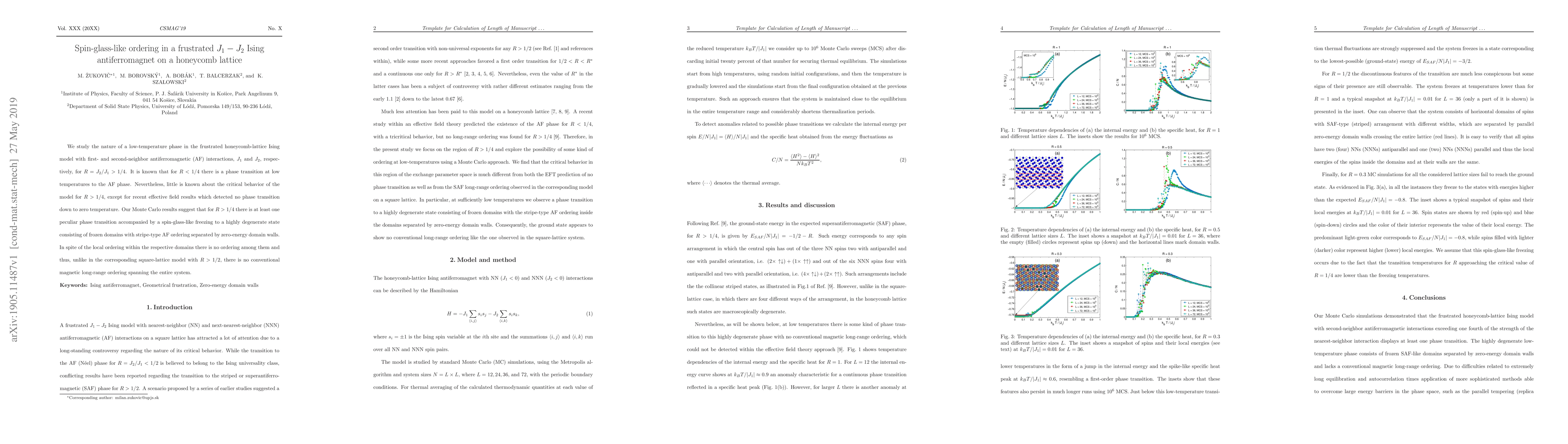 We study the nature of a low-temperature phase in the frustrated honeycomb-lattice Ising model with first- and second-neighbor antiferromagnetic (AF) interactions, $J_1$ and $J_2$, respectively, for $R = J_2/J_1 > 1/4$. It is known that for $R < 1/4$ there is a phase transition at low temperatures to the AF phase. Nevertheless, little is known about the critical behavior of the model for $R > 1/4$, except for recent effective field results which detected no phase transition down to zero temperature. Our Monte Carlo results suggest that for $R > 1/4$ there is at least one peculiar phase transition accompanied by a spin-glass-like freezing to a highly degenerate state consisting of frozen domains with stripe-type AF ordering separated by zero-energy domain walls. In spite of the local ordering within the respective domains there is no ordering among them and thus, unlike in the corresponding square-lattice model with $R > 1/2$, there is no conventional magnetic long-range ordering spanning the entire system.