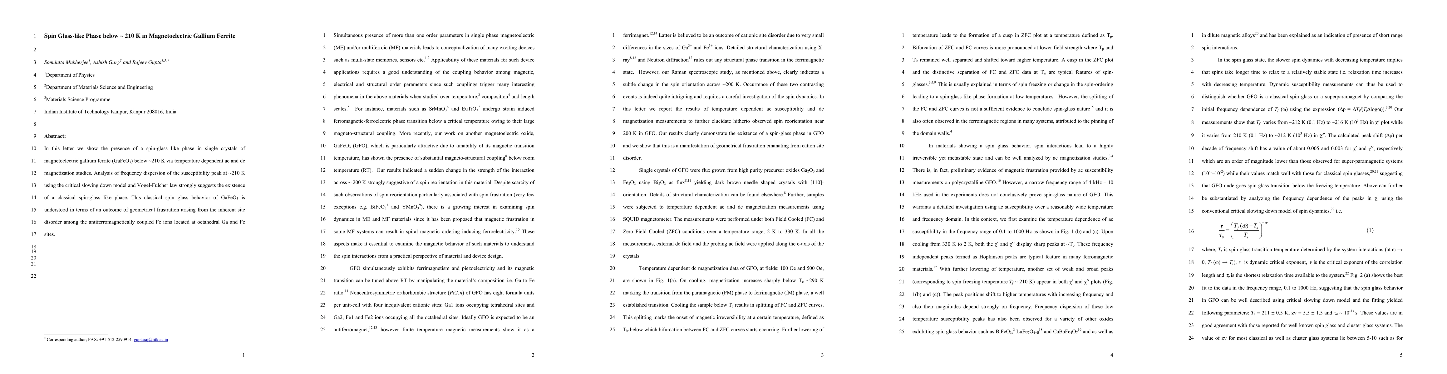 Research found a spin-glass phase in magnetoelectric gallium ferrite below 210K, suggesting a classical spin-glass behavior due to geometrical frustration caused by disorder among Fe ions.