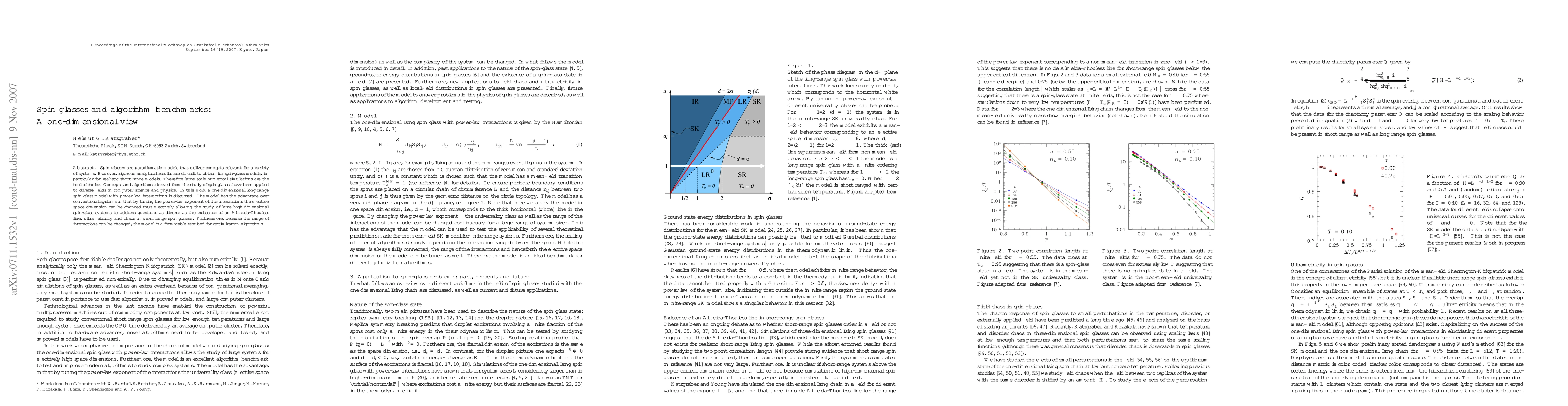 This paper explores a one-dimensional long-range spin-glass model with power-law interactions, allowing for the study of high-dimensional spin-glass systems by adjusting interaction parameters. The model serves as a benchmark for optimization algorithms and addresses questions like the Almeida-Thouless line and chaos in short-range spin glasses.