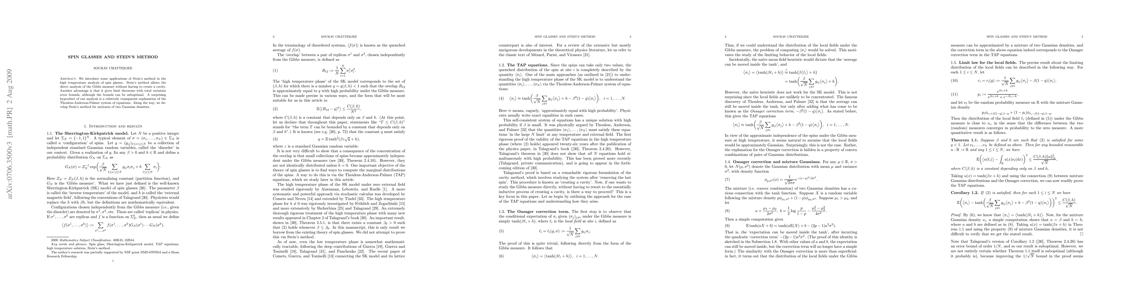 The paper applies Stein's method to the high-temperature analysis of spin glasses, enabling direct analysis of the Gibbs measure without creating a cavity, and providing limit theorems with total variation error bounds.