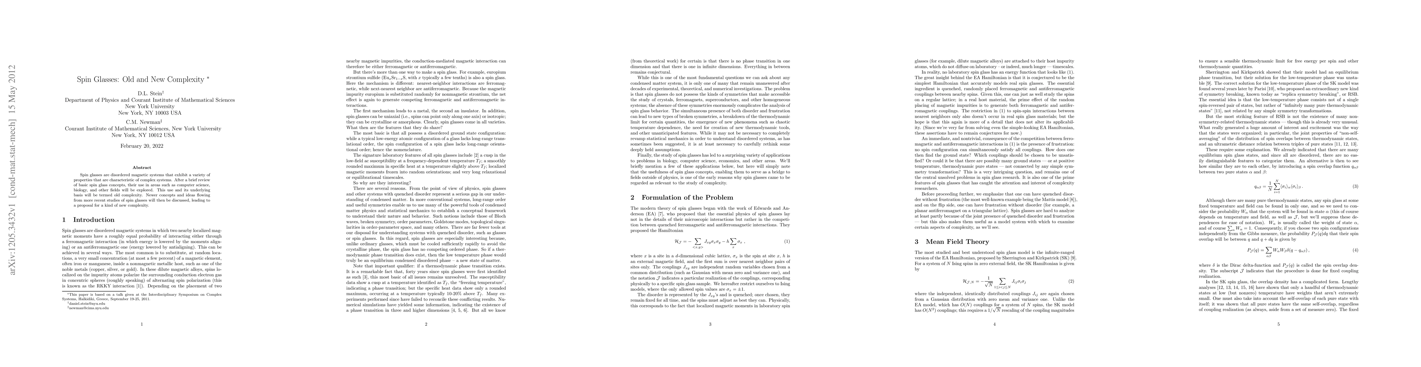 This paper reviews spin glasses, disordered magnetic systems with complex properties, and explores their applications in computer science, biology, and other fields, termed "old complexity." It then introduces newer concepts from recent studies, proposing a framework for "new complexity."