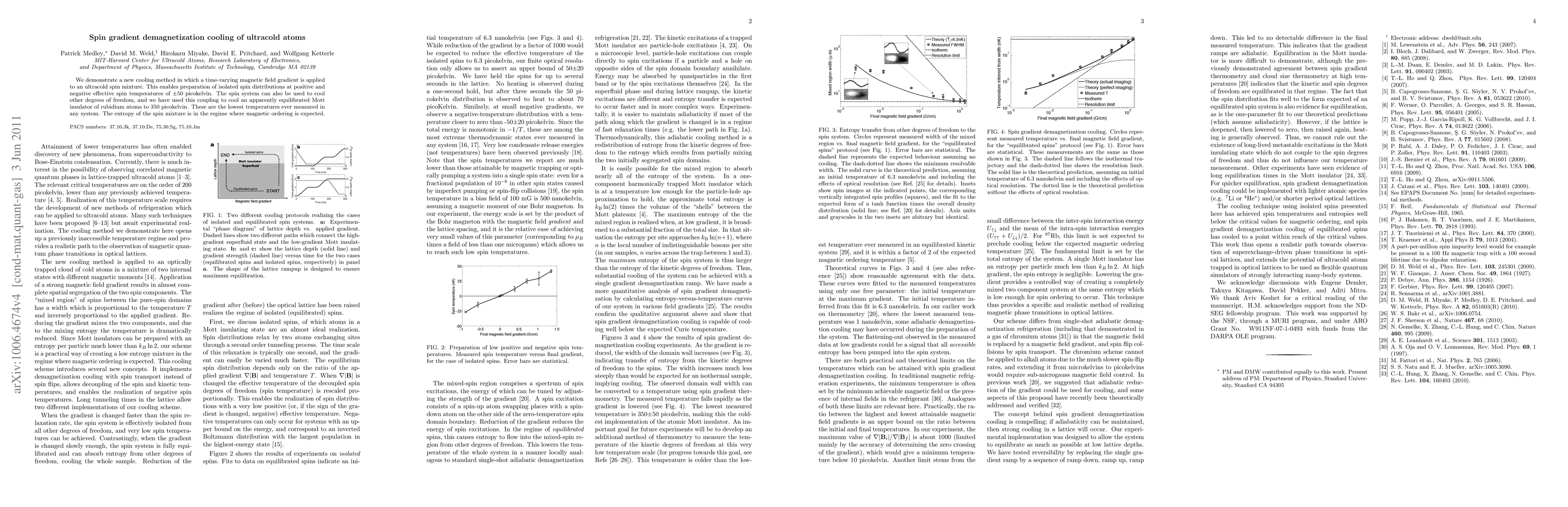 This paper presents a novel cooling technique using spin gradient demagnetization to achieve ultralow temperatures for ultracold atoms, reaching spin temperatures of +/-50 picokelvin and reducing rubidium atoms in a Mott state to 350 picokelvin, the lowest temperatures ever recorded.
