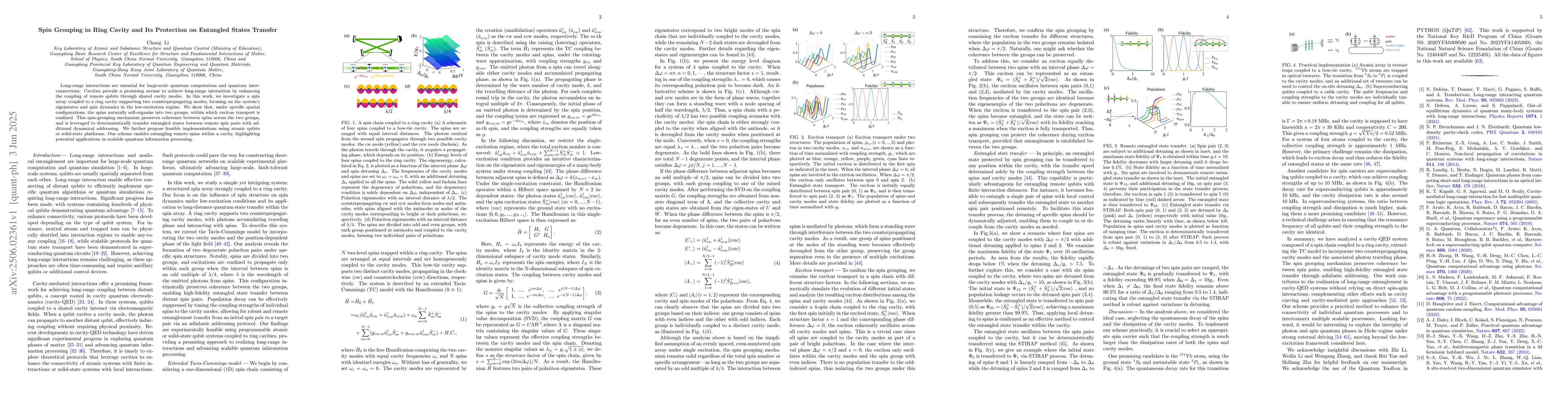 Long-range interactions are essential for large-scale quantum computation and quantum interconnections. Cavities provide a promising avenue to achieve long-range interaction by enhancing the coupling of remote qubits through shared cavity modes. In this work, we investigate a spin array coupled to a ring cavity supporting two counterpropagating modes, focusing on the system's eigenstates and spin dynamics in the low-excitation regime. We show that, under specific spatial configurations, the spins naturally self-organize into two groups, within which exciton transport is confined. This spin-grouping mechanism preserves coherence between spins across the two groups, and is leveraged to deterministically transfer entangled states between remote spin pairs with additional dynamical addressing. We further propose feasible implementations using atomic qubits or solid-state platforms. Our scheme enables entangling remote spins within a cavity, highlighting potential applications in scalable quantum information processing.