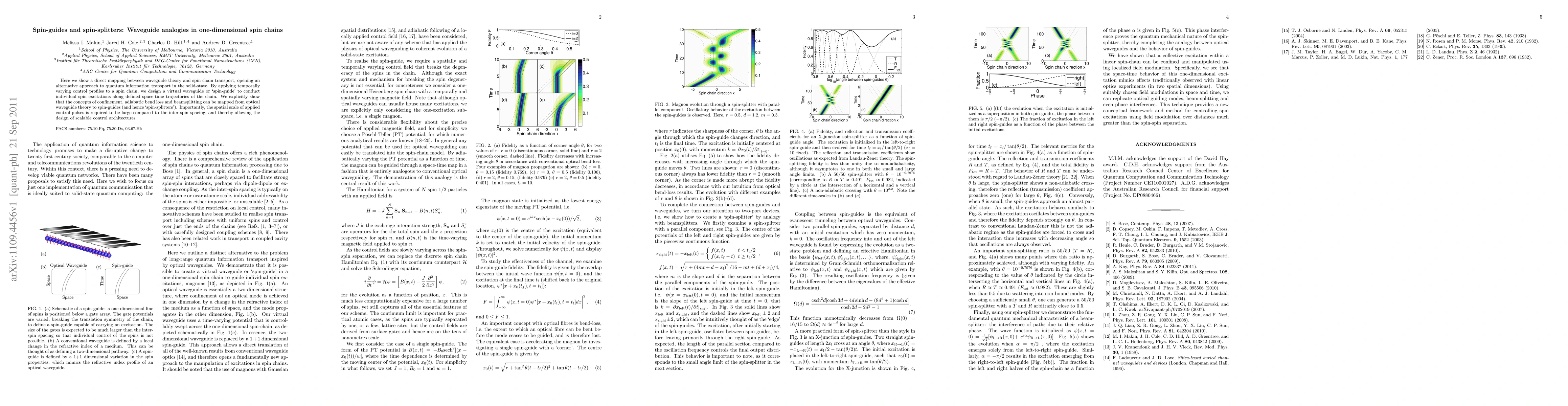 This research establishes a connection between waveguide theory and spin chain transport, enabling new methods for quantum information transfer in solids. By using temporally varied control profiles, the authors design 'spin-guides' to direct individual spin excitations along specific paths, effectively mimicking optical waveguide concepts like confinement, bend loss, and beamsplitting, all scaleable for larger systems.