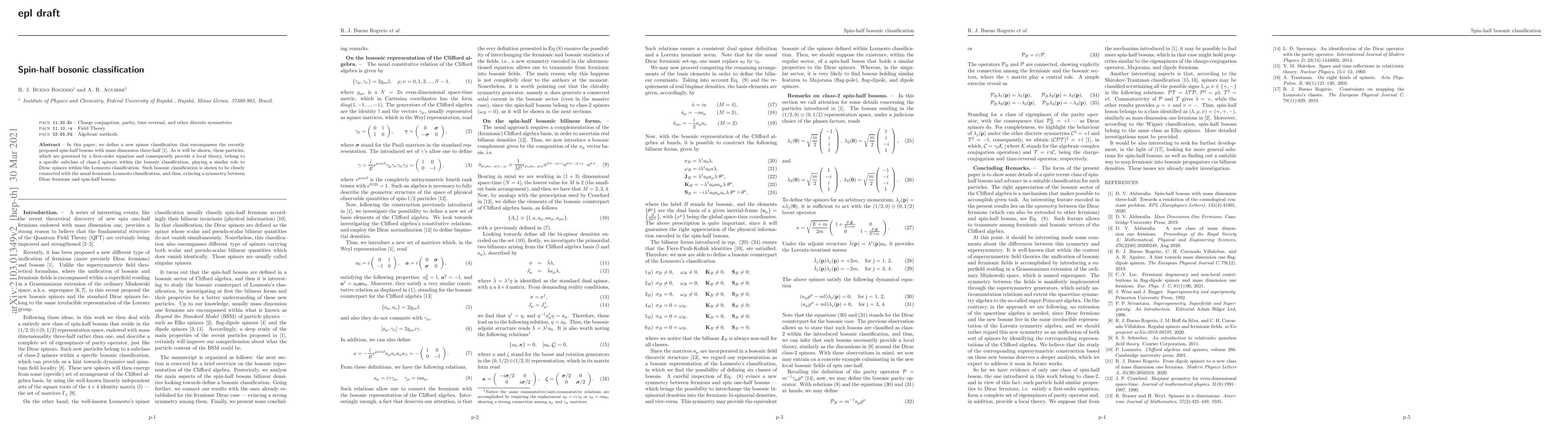 This paper introduces a new spinor classification for spin-half bosons with mass dimension three-half, showing they belong to a subclass of class-2 spinors and exhibit a symmetry with Dirac fermions in the Lounesto classification. These bosons are governed by a first-order equation, forming a local theory.