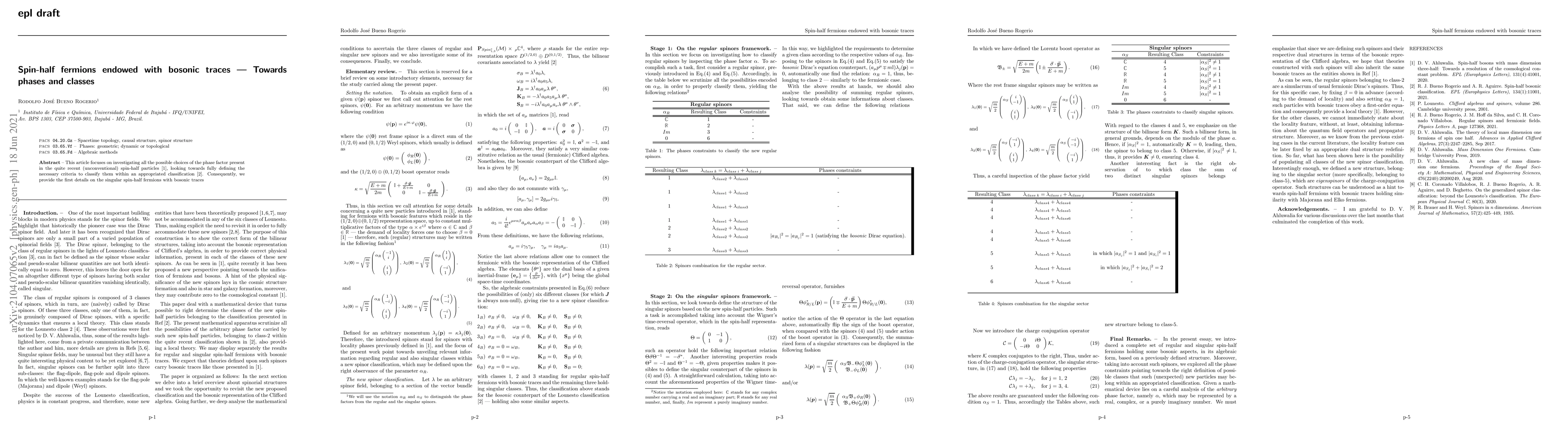 This research explores unconventional spin-half fermions with bosonic traces, identifying phase factors and outlining criteria for classification. It presents initial insights into these unique spin-half fermions.