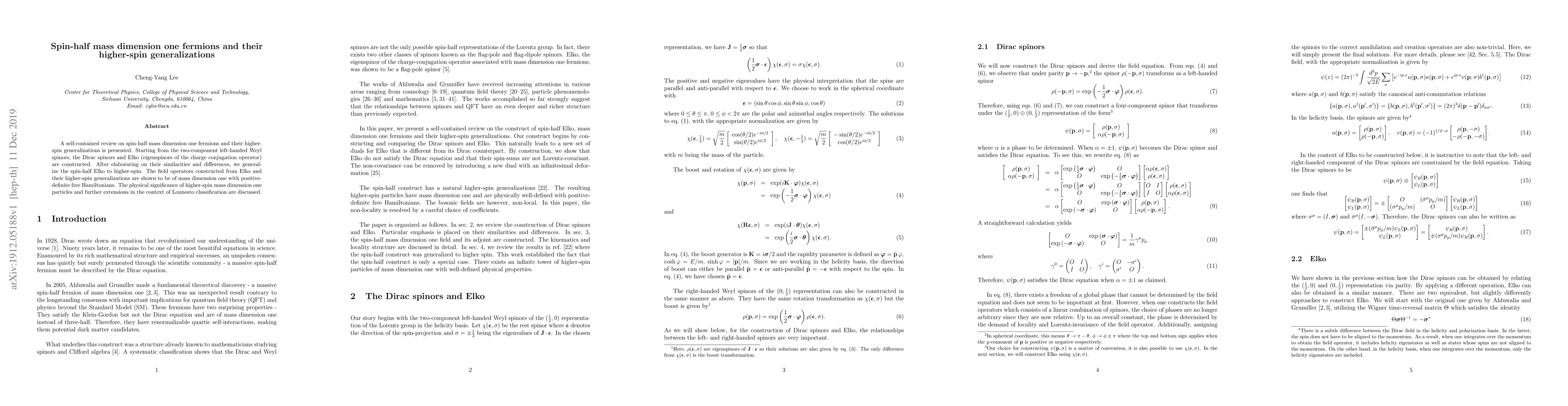 This paper reviews spin-half mass dimension one fermions, including left-handed Weyl spinors, Dirac spinors, and Elko spinors, and generalizes Elko to higher-spin. The constructed field operators maintain mass dimension one and positive-definite free Hamiltonians, with implications for Lounesto classification.