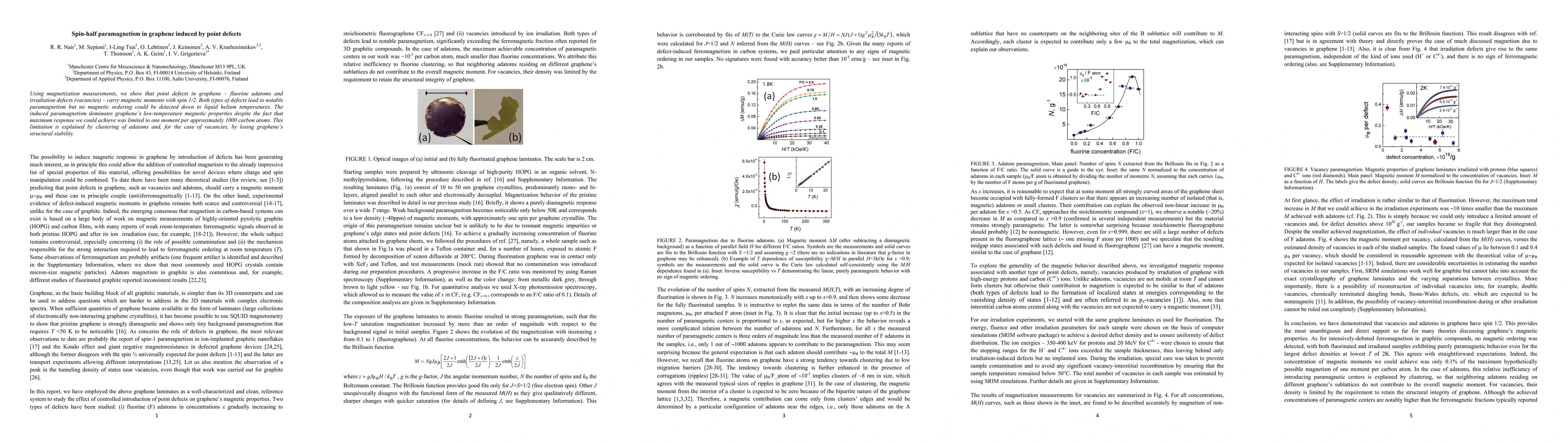 This study reveals that point defects in graphene, such as fluorine adatoms and irradiation-induced vacancies, exhibit spin-half paramagnetism, with no detectable magnetic ordering at low temperatures. The induced paramagnetism significantly influences graphene's magnetic behavior, though the effect is limited by the low density of defects and structural stability issues.