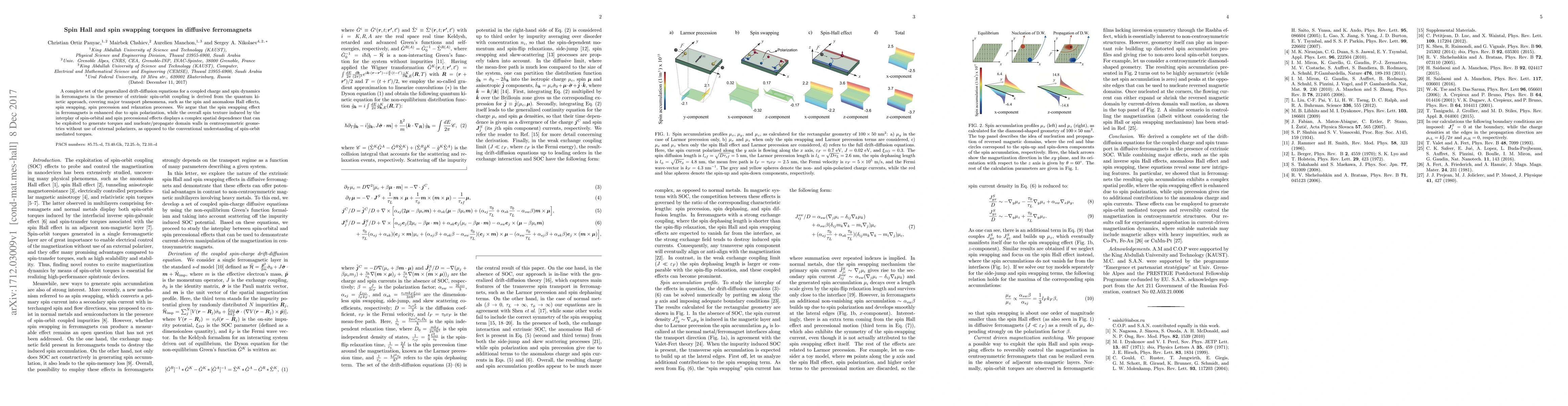 A complete set of the generalized drift-diffusion equations for a coupled charge and spin dynamics in ferromagnets in the presence of extrinsic spin-orbit coupling is derived from the quantum kinetic approach, covering major transport phenomena, such as the spin and anomalous Hall effects, spin swapping, spin precession and relaxation processes. We argue that the spin swapping effect in ferromagnets is enhanced due to spin polarization, while the overall spin texture induced by the interplay of spin-orbital and spin precessional effects displays a complex spatial dependence that can be exploited to generate torques and nucleate/propagate domain walls in centrosymmetric geometries without use of external polarizers, as opposed to the conventional understanding of spin-orbit mediated torques.