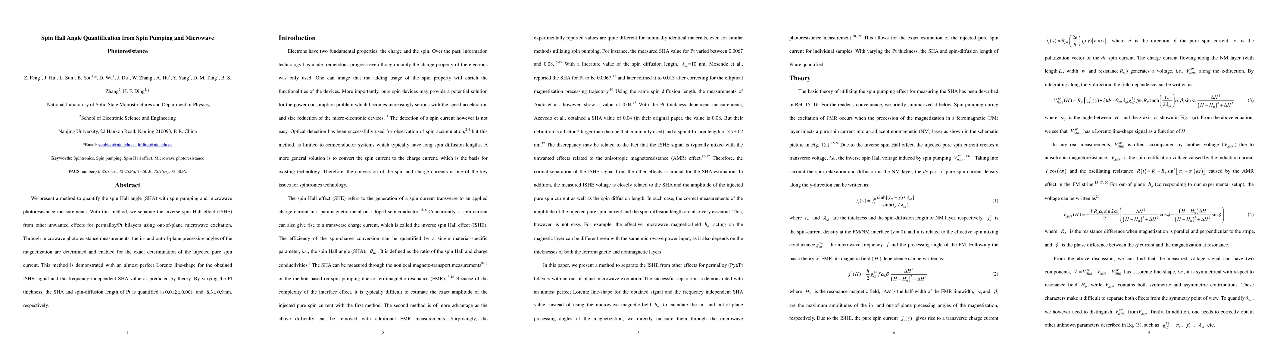 This paper proposes a method to quantify the spin Hall angle (SHA) using spin pumping and microwave photoresistance, achieving an almost perfect Lorentz line-shape for the inverse spin Hall effect (ISHE) signal. The SHA and spin-diffusion length of Pt are determined to be 0.012 (0.001) and 8.3 (0.9) nm, respectively.