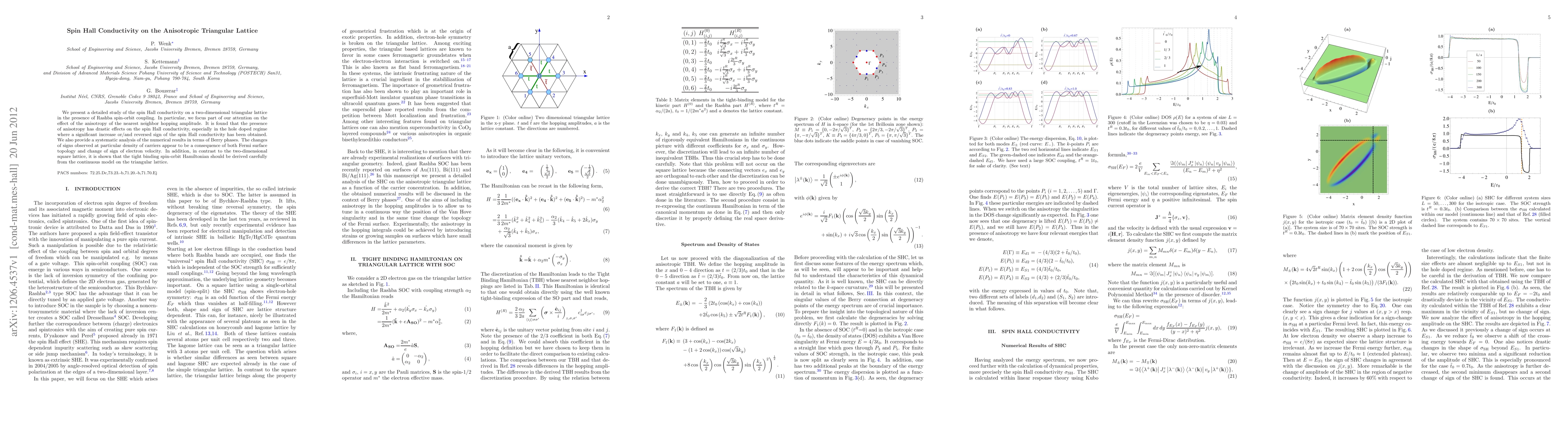 This study investigates the spin Hall conductivity on a two-dimensional anisotropic triangular lattice under Rashba spin-orbit coupling, revealing significant effects of anisotropy, especially in hole-doped conditions. The research highlights the importance of Fermi surface topology and electron velocity in sign changes, and emphasizes the need for careful derivation of the tight binding spin-orbit Hamiltonian on triangular lattices.