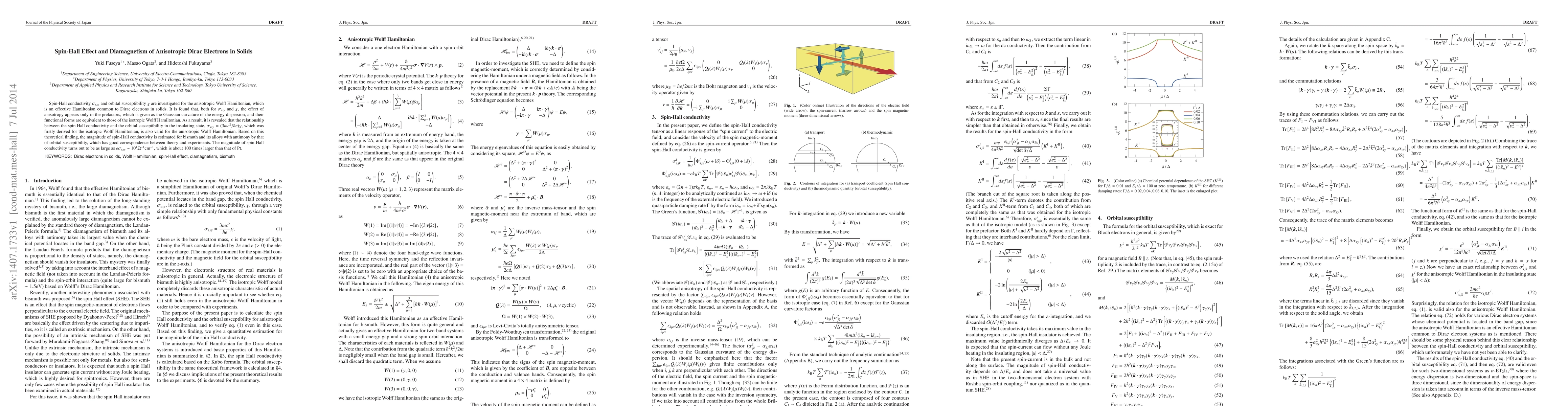 This paper investigates the spin-Hall effect and diamagnetism in anisotropic Dirac electrons using the Wolff Hamiltonian, finding that anisotropy affects only the prefactors of spin-Hall conductivity and orbital susceptibility. The relationship $\sigma_{{\rm s}xy}=(3mc^2/\hbar e)\chi$ holds for both isotropic and anisotropic cases, leading to a large estimated spin-Hall conductivity for bismuth and its alloys.