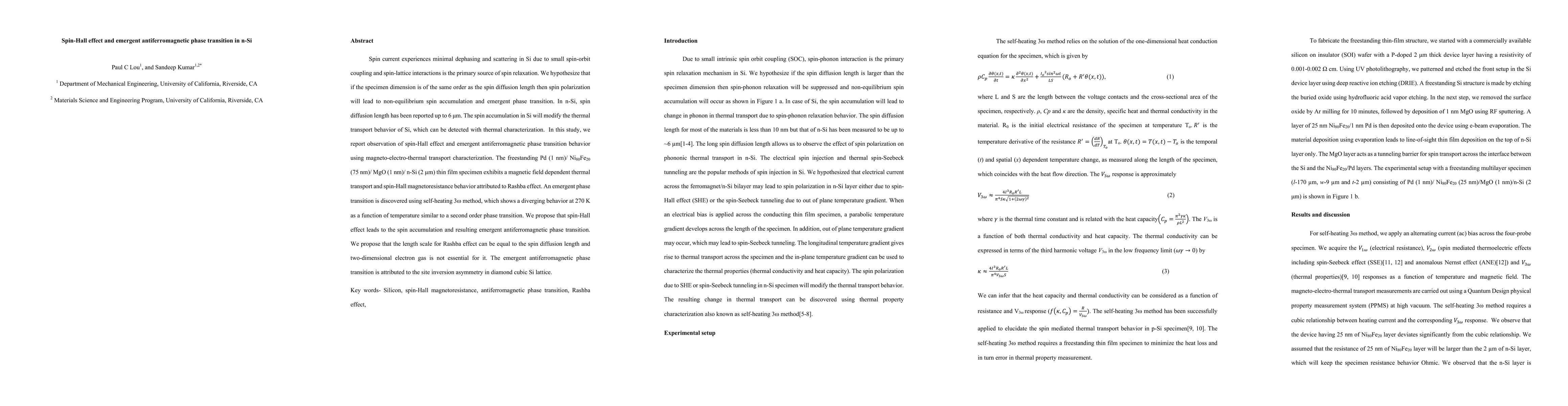 Spin current experiences minimal dephasing and scattering in Si due to small spin-orbit coupling and spin-lattice interactions is the primary source of spin relaxation. We hypothesize that if the specimen dimension is of the same order as the spin diffusion length then spin polarization will lead to non-equilibrium spin accumulation and emergent phase transition. In n-Si, spin diffusion length has been reported up to 6 {\mu}m. The spin accumulation in Si will modify the thermal transport behavior of Si, which can be detected with thermal characterization. In this study, we report observation of spin-Hall effect and emergent antiferromagnetic phase transition behavior using magneto-electro-thermal transport characterization. The freestanding Pd (1 nm)/ Ni80Fe20 (75 nm)/ MgO (1 nm)/ n-Si (2 micron) thin film specimen exhibits a magnetic field dependent thermal transport and spin-Hall magnetoresistance behavior attributed to Rashba effect. An emergent phase transition is discovered using self-heating 3omega method, which shows a diverging behavior at 270 K as a function of temperature similar to a second order phase transition. We propose that spin-Hall effect leads to the spin accumulation and resulting emergent antiferromagnetic phase transition. We propose that the length scale for Rashba effect can be equal to the spin diffusion length and two-dimensional electron gas is not essential for it. The emergent antiferromagnetic phase transition is attributed to the site inversion asymmetry in diamond cubic Si lattice.
