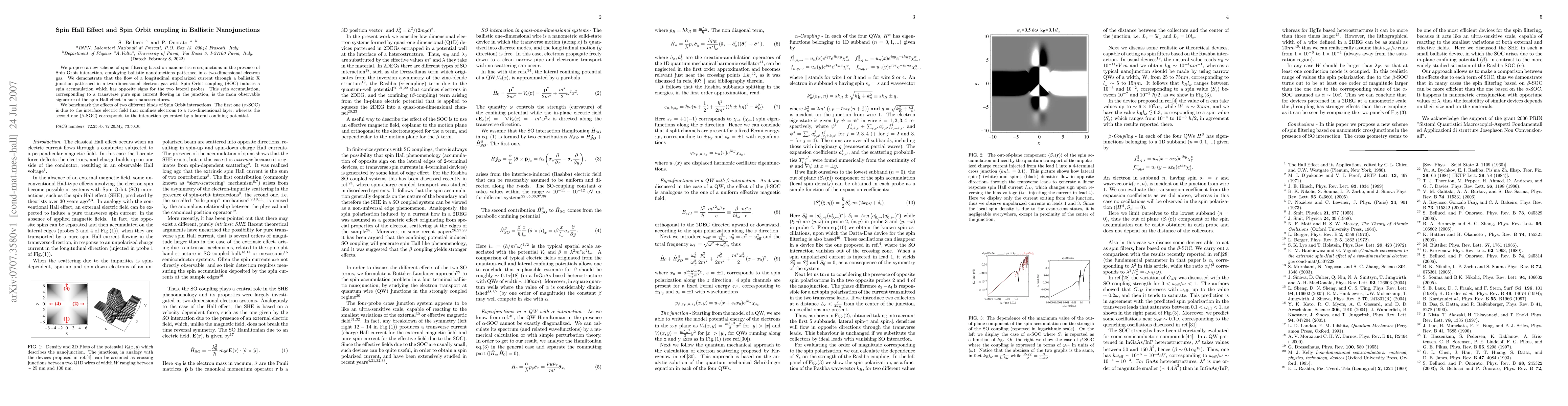 Summary: The paper proposes a spin filtering mechanism using ballistic nanojunctions with Spin Orbit coupling in a two-dimensional electron gas, demonstrating a spin Hall effect where different Spin Orbit interactions induce opposite spin accumulations in lateral probes. It examines two types of Spin Orbit interactions, $\alpha$-SOC from interface fields and $\beta$-SOC from lateral confinement.