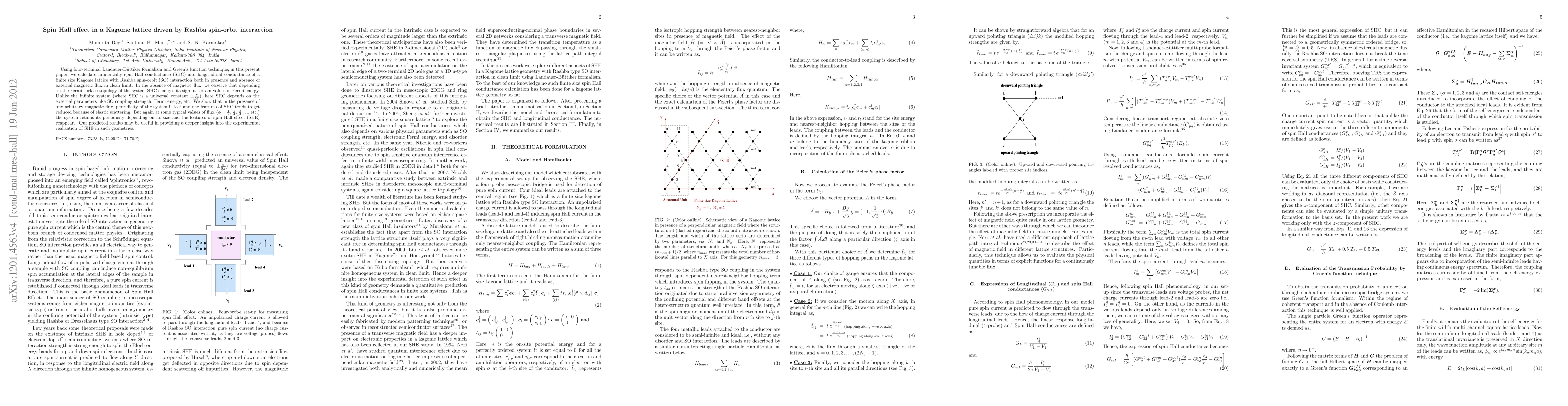 Researchers studied spin Hall effect in a Kagome lattice with Rashba spin-orbit interaction, finding that its behavior changes with Fermi energy and external magnetic flux, but retains periodicity at certain flux values.