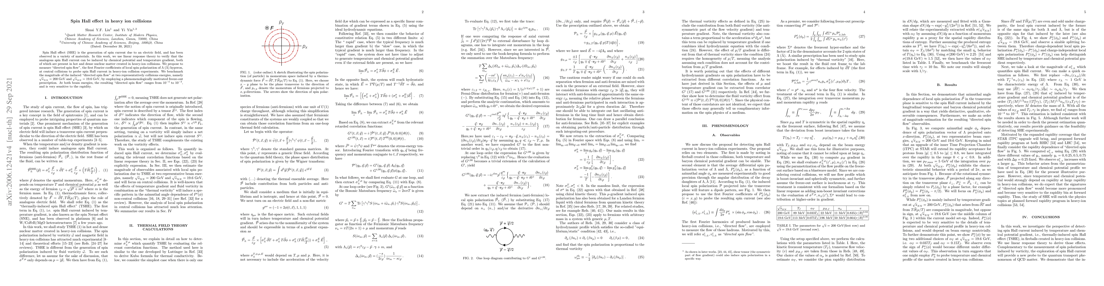 Spin Hall effect (SHE) is the generation of spin current due to an electric field, and has been observed in a variety of materials. The analogous spin Hall current can be induced by chemical potential and temperature gradient, both of which are present in hot and dense nuclear matter created in heavy-ion collisions. In this letter, we investigate the perspective of detecting spin Hall current experimentally. We propose to measure "directed spin flow", the first Fourier coefficients of local spin polarization of $\Lambda$ ($\bar{\Lambda}$) hyperon, at central collisions to probe spin Hall current. To quantify induced spin current, we evaluate relevant transport coefficients using thermal field theory. We benchmark the magnitude of the induced "directed spin flow" at two representatively collisions energies, namely $\sqrt{s}_{NN}=200~{\rm GeV}$ and $\sqrt{s}_{NN}=19.6~{\rm GeV}$, by employing a phenomenologically motivated freeze-out prescription. At both beam energies, the resulting "directed spin flow" ranges from $10^{-4}$ to $10^{-3}$, and is very sensitive to the rapidity.