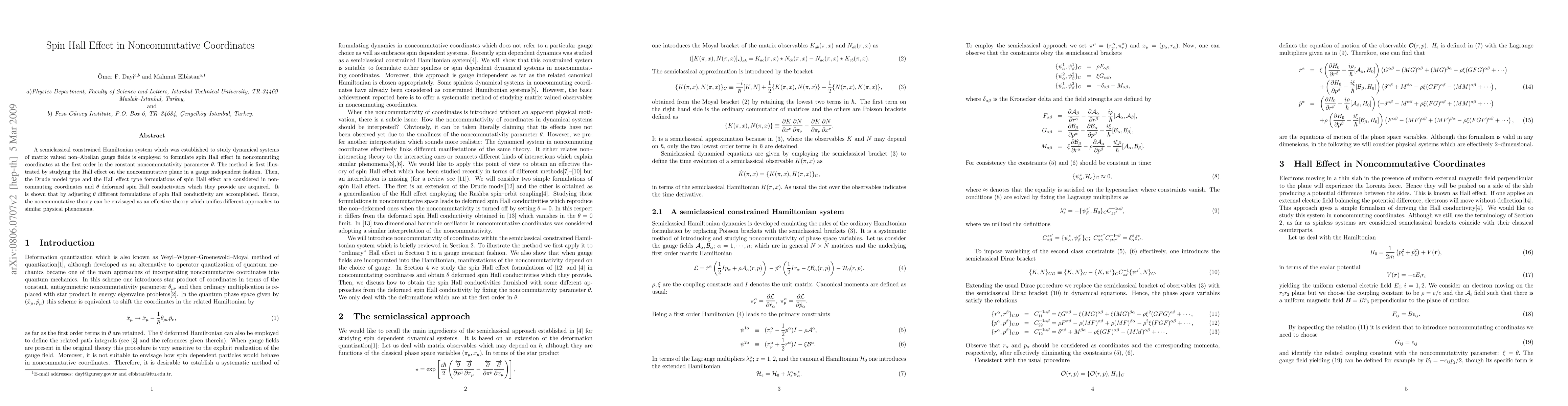 This paper formulates the spin Hall effect in noncommutative coordinates using a semiclassical constrained Hamiltonian system for matrix-valued non-Abelian gauge fields. It demonstrates the effect on the noncommutative plane and shows how varying the noncommutativity parameter θ can yield different formulations of spin Hall conductivity, suggesting a unifying effective theory.