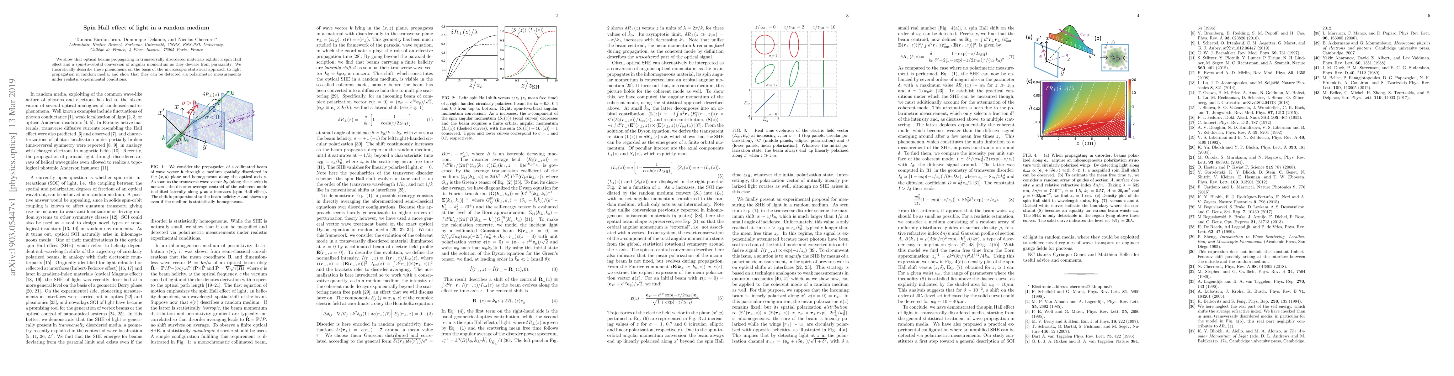 We show that optical beams propagating in transversally disordered materials exhibit a spin Hall effect and a spin-to-orbital conversion of angular momentum as they deviate from paraxiality. We theoretically describe these phenomena on the basis of the microscopic statistical approach to light propagation in random media, and show that they can be detected via polarimetric measurements under realistic experimental conditions