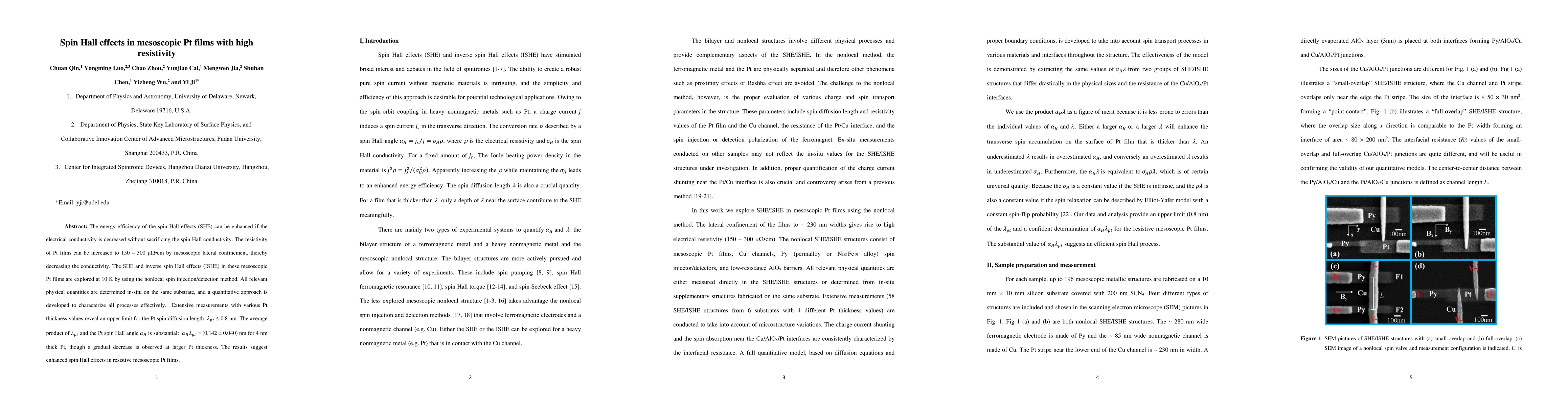 The energy efficiency of the spin Hall effects (SHE) can be enhanced if the electrical conductivity is decreased without sacrificing the spin Hall conductivity. The resistivity of Pt films can be increased to 150-300 {\mu}{\Omega}*cm by mesoscopic lateral confinement, thereby decreasing the conductivity. The SHE and inverse spin Hall effects (ISHE) in these mesoscopic Pt films are explored at 10 K by using the nonlocal spin injection/detection method. All relevant physical quantities are determined in-situ on the same substrate, and a quantitative approach is developed to characterize all processes effectively. Extensive measurements with various Pt thickness values reveal an upper limit for the Pt spin diffusion length: {\lambda}_pt<0.8 nm. The average product of {\lambda}_pt and the Pt spin Hall angle {\alpha}_H is substantial: {\alpha}_H*{\lambda}_pt=(0.142 +/- 0.040)nm for 4 nm thick Pt, though a gradual decrease is observed at larger Pt thickness. The results suggest enhanced spin Hall effects in resistive mesoscopic Pt films.