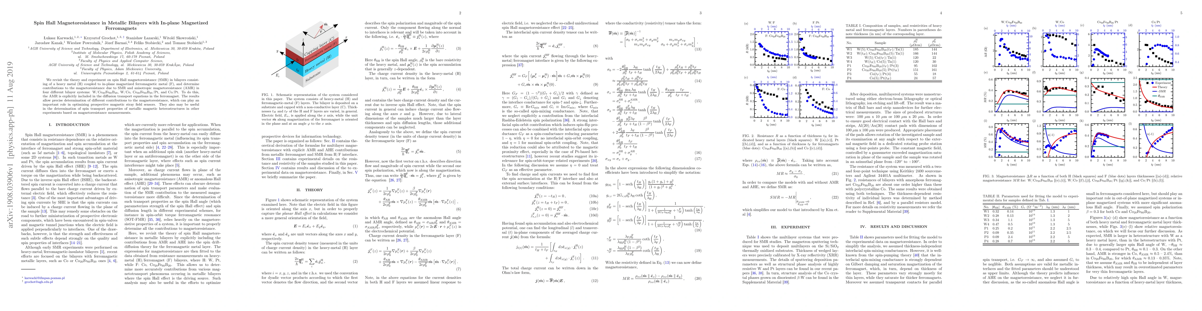We revisit the theory and experiment on spin Hall magnetoresistance (SMR) in bilayers consisting of a heavy metal (H) coupled to in-plane magnetized ferromagnetic metal (F), and determine contributions to the magnetoresistance due to SMR and anisotropic magnetoresistance (AMR) in four different bilayer systems: W/$\text{Co}_{20}\text{Fe}_{60}\text{B}_{20}$, W/Co, $\text{Co}_{20}\text{Fe}_{60}\text{B}_{20}$/Pt, and Co/Pt. To do this, the AMR is explicitly included in the diffusion transport equations in the ferromagnet. The results allow precise determination of different contributions to the magnetoresistance, which can play an important role in optimizing prospective magnetic stray field sensors. They also may be useful in the determination of spin transport properties of metallic magnetic heterostructures in other experiments based on magnetoresistance measurements.