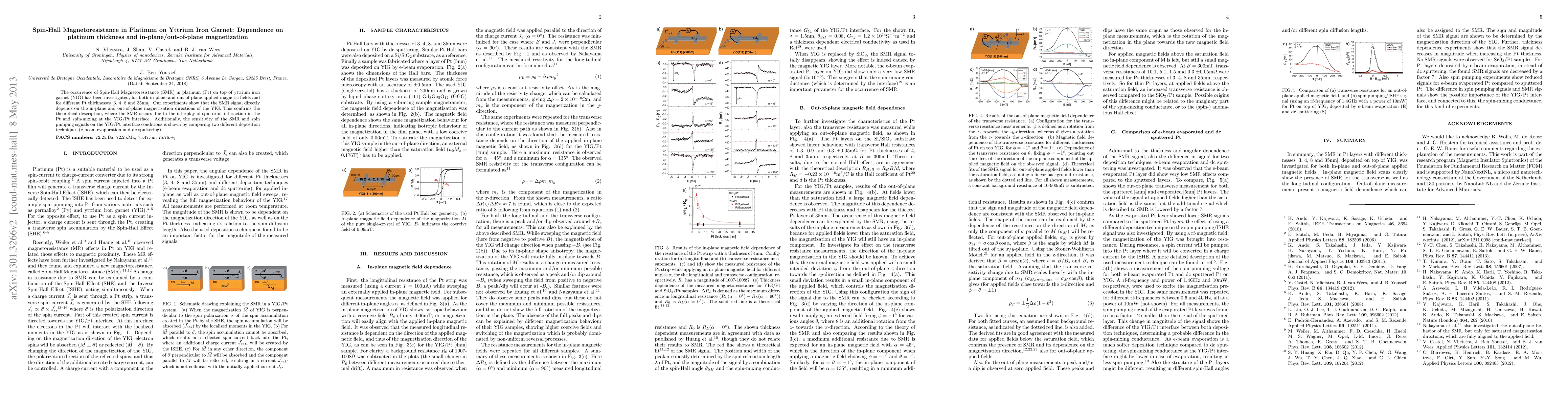 This paper investigates Spin-Hall Magnetoresistance (SMR) in platinum on yttrium iron garnet (YIG) under varying magnetic field orientations and Pt thicknesses. The study confirms that SMR depends on the magnetization direction of YIG and is influenced by the Pt/YIG interface conditions, as demonstrated by different deposition techniques.