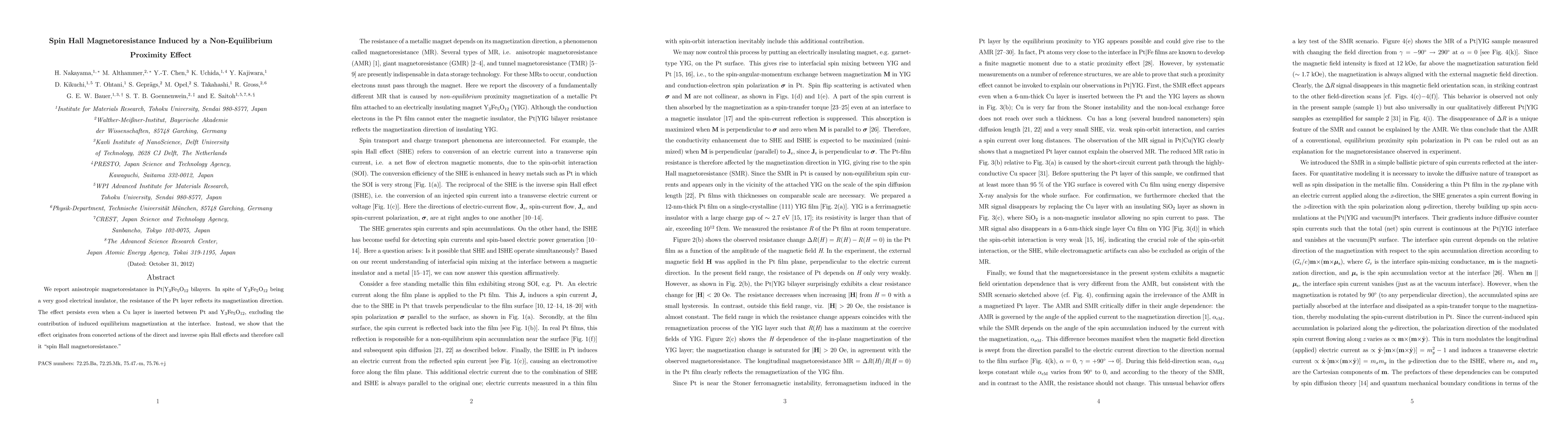 The research reveals anisotropic magnetoresistance in Pt|Y3Fe5O12 bilayers, where Pt's resistance varies with Y3Fe5O12's magnetization direction. The effect, termed "spin Hall magnetoresistance," persists with a Cu layer insertion, indicating it arises from non-equilibrium spin Hall effects rather than equilibrium magnetization.