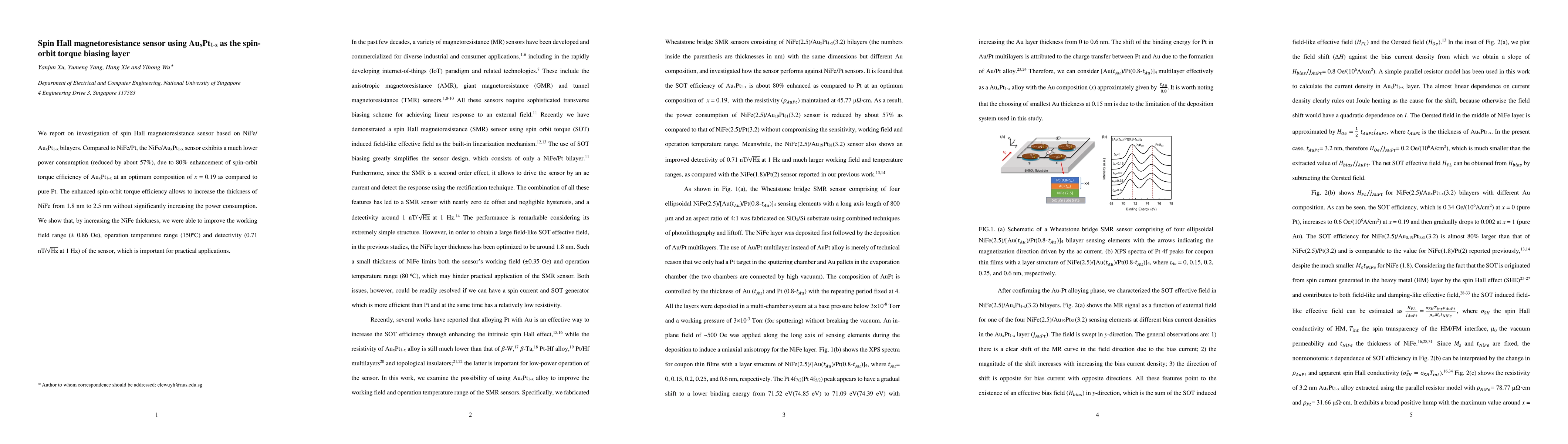 This paper investigates a spin Hall magnetoresistance sensor utilizing NiFe/Au$_x$Pt$_{1-x}$ bilayers, which shows a 57% reduction in power consumption due to an 80% increase in spin-orbit torque efficiency at x = 0.19. The enhanced efficiency allows for a thicker NiFe layer, improving the sensor's field range, temperature range, and detectivity for practical applications.
