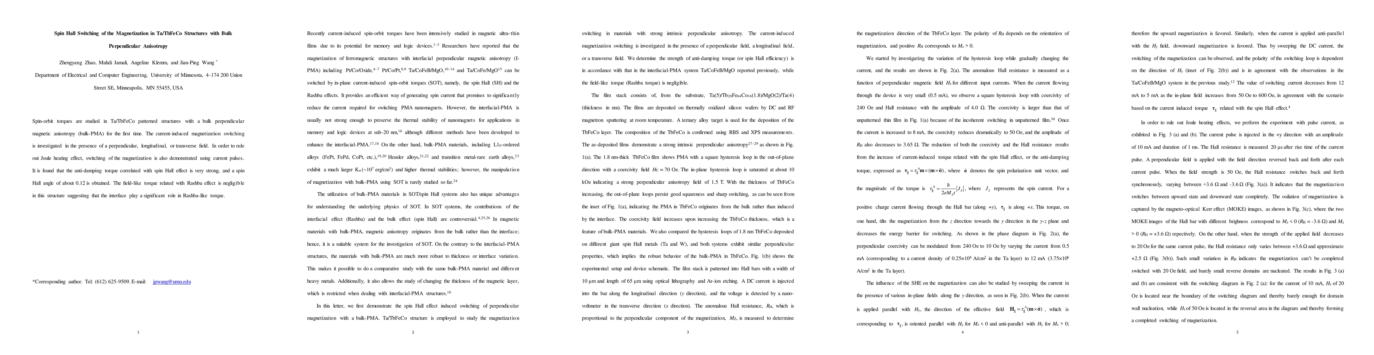 This paper investigates spin-orbit torques in Ta/TbFeCo structures with bulk perpendicular anisotropy, demonstrating strong anti-damping torque via spin Hall effect and negligible field-like torque, indicating the interface's significant role in Rashba-like torque. The magnetization switching is confirmed using current pulses to rule out Joule heating effects.